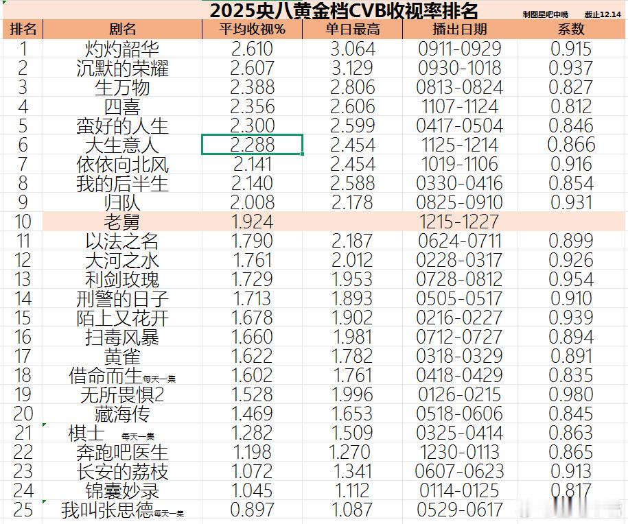 2025年央八黄金档电视剧酷云收视率排名、CVB收视率排名。今年基本上就这样了,唯一的变数是《老舅》能冲到第几名?前三名基本上不会变了吧?2025年央八收视率排名