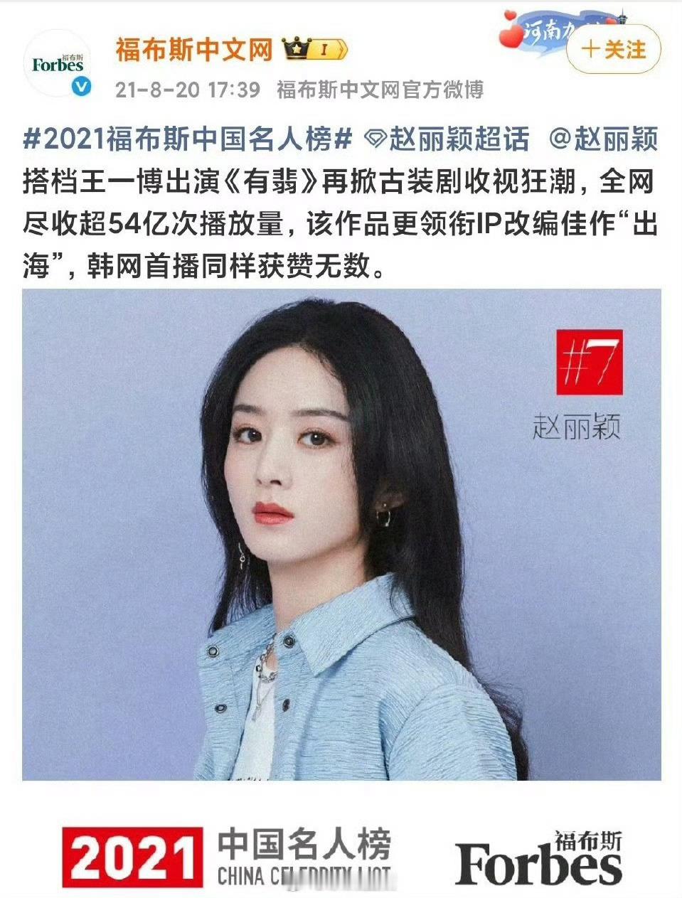 赵丽颖连续两年上福布斯名人榜都是因为有翡啊。