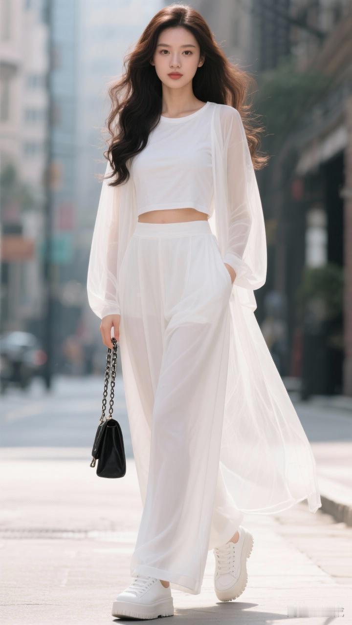 都市时尚少女,白色运动套装搭配透明纱衫,轻松自在。