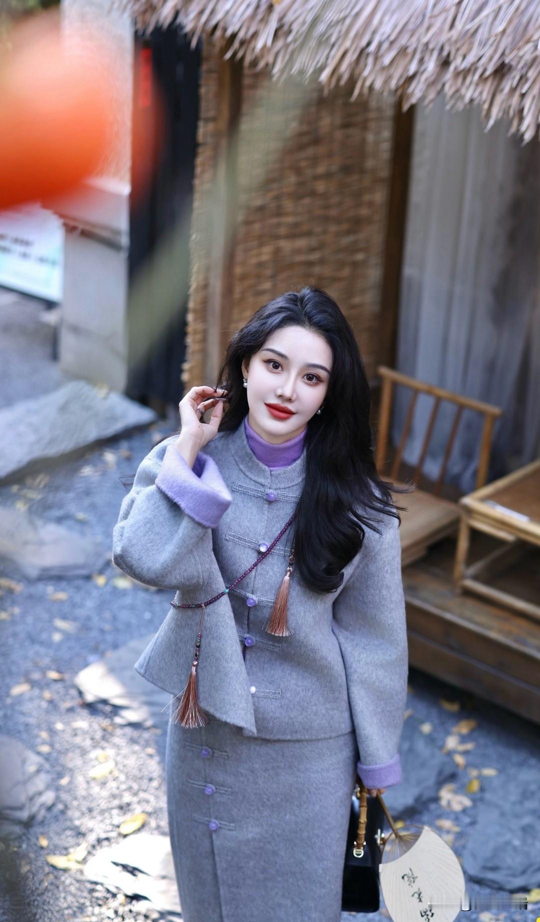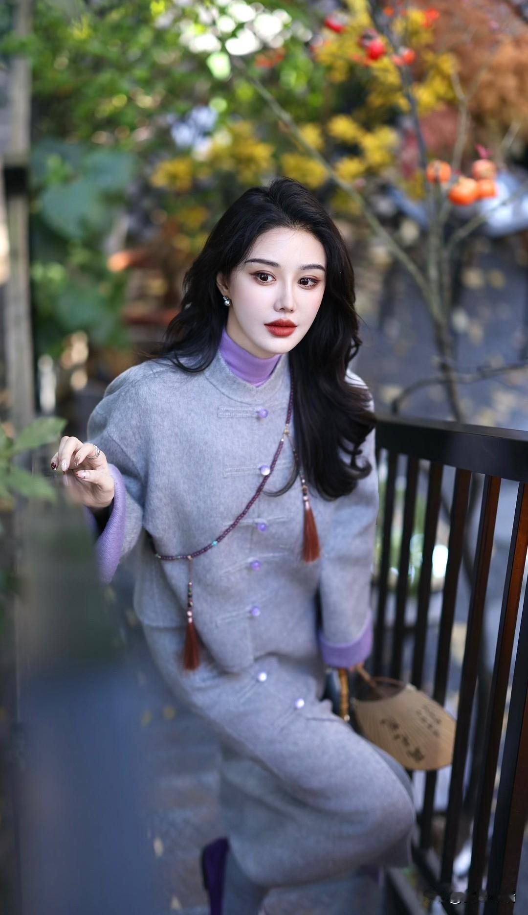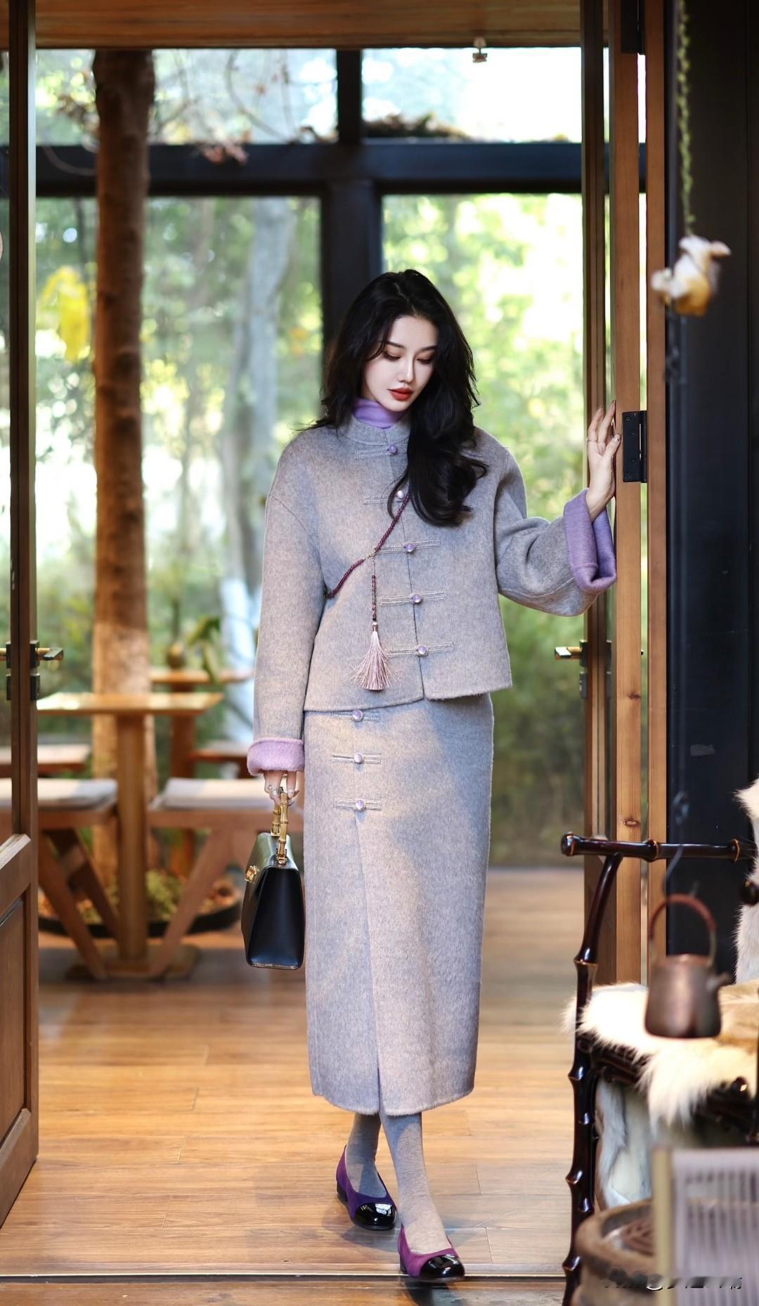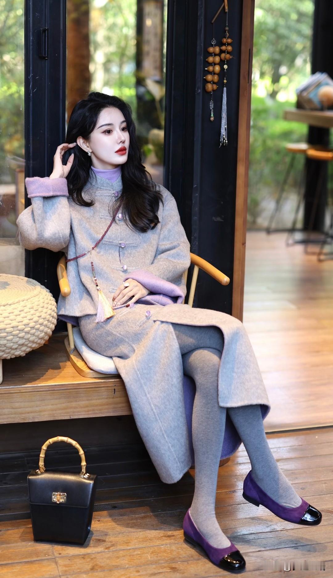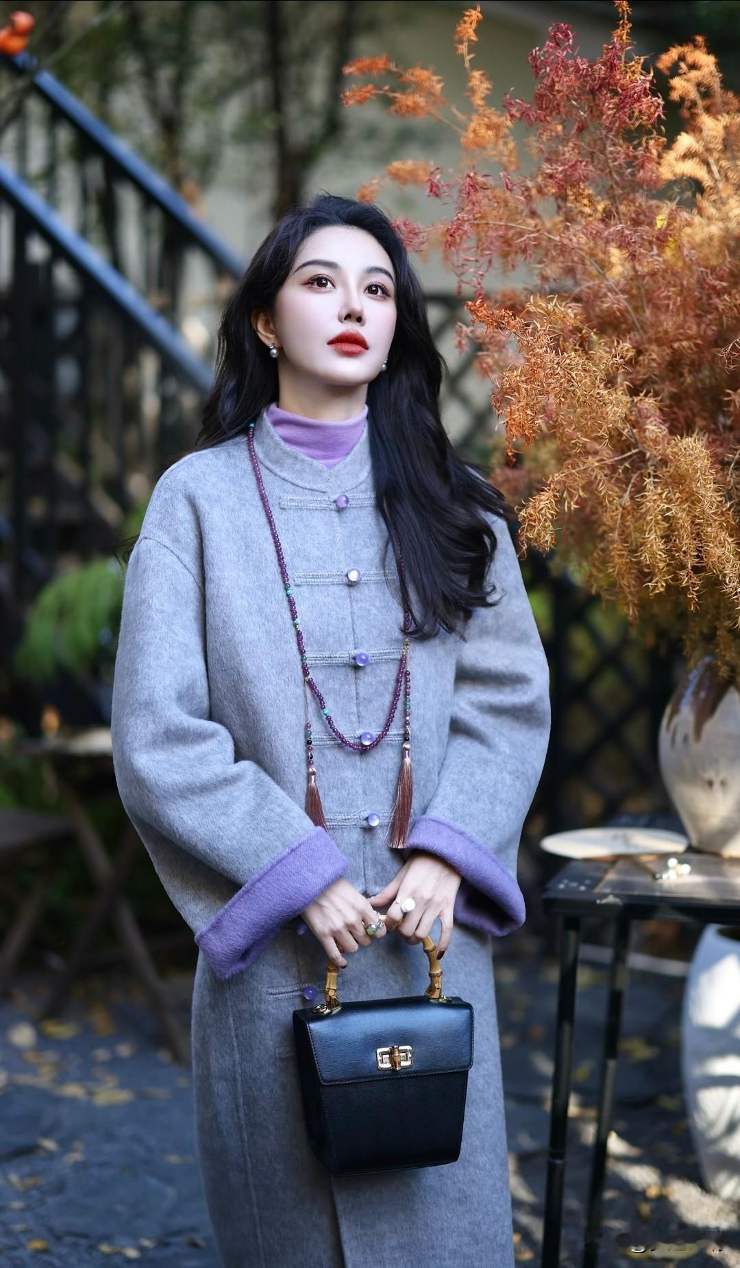 优雅灰大衣搭配紫色丝巾,复古风十足!