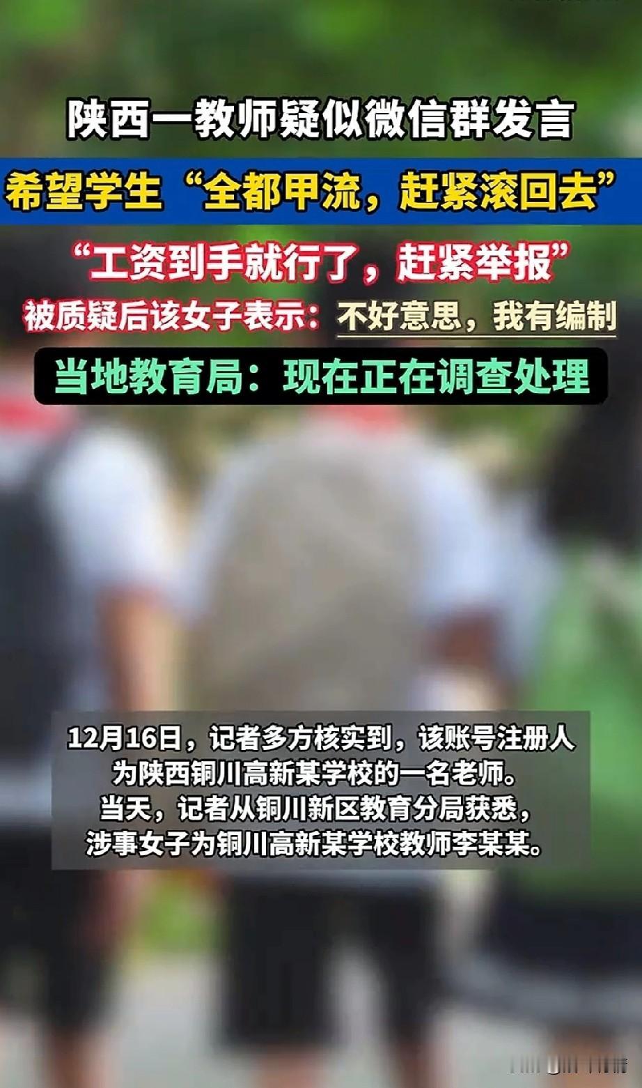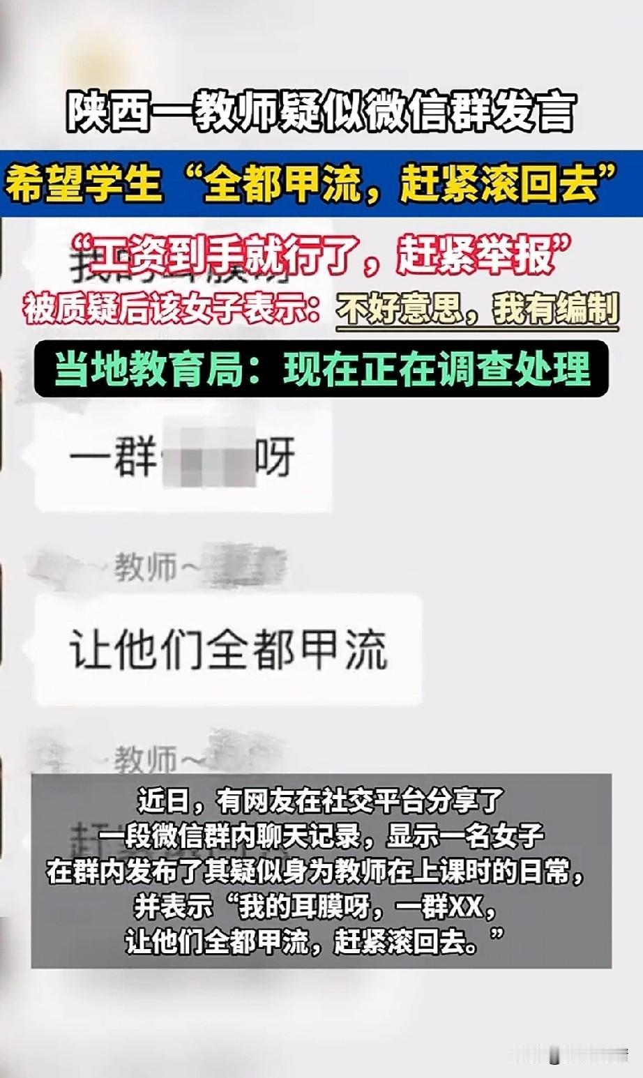 现在公立学校学生成绩不如私立好的原因找到了,就是这群有编制的蛀虫造成的,陕西铜川高新某学校的一名老师, 居然在微信群里发布真心话, 希望全部学生得甲流, 赶紧滚回去! 还叫嚣着工资到手就行, 不好意思,我有编制! 赶紧举报吧,我不怕! 这嚣张跋扈的言论, 居然出自一名有编制的老师之口, 真不知道这位老师是如何进入体制内的,师者,传道授业解惑也! 这样的人根本不配做老师, 学生课堂比较乱, 那是你的能力有问题, 德不配位,自然乱了, 你不管就是不对, 居然出如此恶毒的语言对自己的学生, 实在让人气的牙痒痒, 如今引起了众怒, 学校这才表示正在调查, 证据确凿还需要调查什么? 不如早点清除害群之马, 大家对于陕西这位老师的做法怎么看? 陕西身边事 学校教育怪现状 高中成绩分化 私立学校待遇 私立学校压力