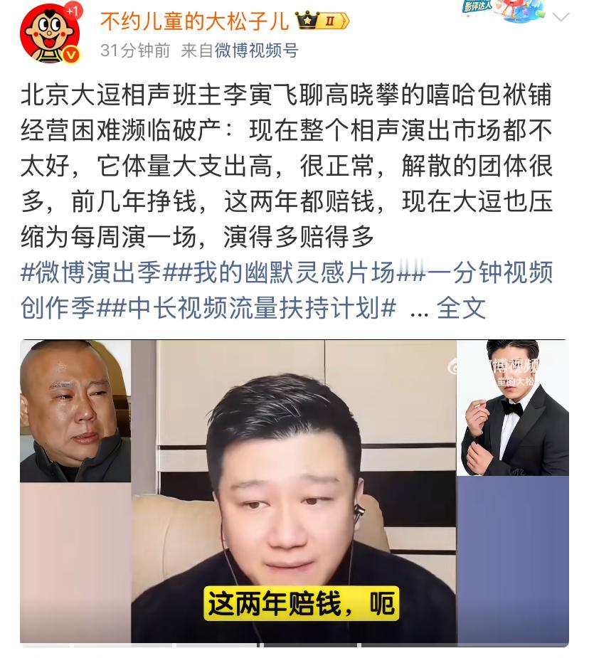 【著名相声演员李寅飞评价高晓攀破产危机,相声虚假繁荣成为现实!】 近日,著名相声演员、春晚常客、郭德纲前弟子、大逗相声社班主李寅飞针对高晓攀面临破产危机进行评价,李寅飞直言相声整个市场都不好了,包括大逗也是如此。在李寅飞评价的过程中,也是非常无奈,甚至有些惋惜。其实,今年以来曹云金的听云轩也是面临一家小园子关闭的危机,嘻哈包袱铺、大逗相声社也是举步维艰,甚至出现了犹如钱城大师、侯耀华、杨议等相声演员转行做主播带货。通过这些能够看出,相声行业的虚假繁荣已然成为现实,虽然德云社一家独大,但是也是无法掩盖相声行业的没落! 其实,李寅飞的评价也是非常有一定的根据的,毕竟现在经济出现一定的徘徊,大众口袋也是空空,对于一些文化娱乐需求也是下降了不少,这个也是相声行业没落的一个原因;另外一个原因是这些年,这些相声班社的经营出现问题,摊子铺的太太,又没有相对出色的相声演员能够引流,无法吸引观众,生意自然而然就会差很多;还有一个原因就是现在短视频的崛起,大众追求娱乐的渠道变宽了,能够通过抖音等短视频获得快乐,所以自然会减少去小园子的次数,也是影响小园子经营的一个原因。 总的来说,德云社一家独秀是说明不了问题的,李寅飞的坦言其实才是整个相声市场最直白的心声,也是相声行业最直接存在的问题!
