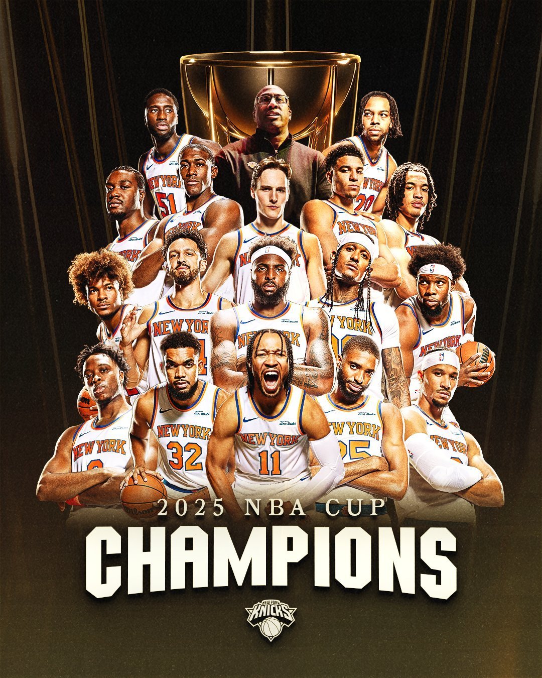 12月17日,在NBA杯总决赛中,尼克斯以124-113战胜马刺,首夺NBA杯冠军,也终结了球队自1973年NBA总冠军后以来的冠军荒。布伦森全场贡献25分4篮板8助攻,淘汰赛场均33.3分6.7助攻,当选MVP。