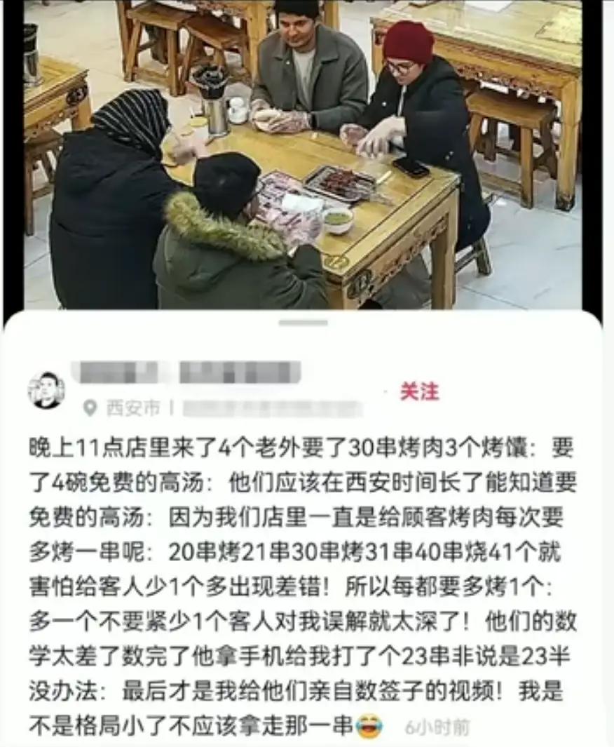 西安,四位印度留学生去吃饭,点了30串烤肉,还点了免费的高汤,可肉串icon端上来后,却说只有23串,少了7串,老板也没惯着他们,当着他们面数串,不仅没少,他还多送了一串,最后当着他们面,把多出来的那一串拿走了。 当天晚上,四位留学生走进烤肉店,一下子点了30串烤肉,可当满满一盘烤肉端上桌,留学生们拿起烤串数了数,立刻面露疑惑,随即叫来老板,语气笃定地表示少了7串,实际只有23串。面对质疑,老板没有丝毫慌乱,也没有和留学生们争执,而是笑着走到桌前,当着四人的面,一根根清点起烤串。 “1、2、3……31!”随着最后一个数字落下,在场的人都愣了一下,不仅没少,反而还多了一串。原来老板看几位留学生是远道而来的客人,特意多送了一串。 紧接着,老板拿起那多送的一串烤串,笑着说道:“这串是我额外送的,既然你们觉得数量不对,那这串我就先收回来啦。”这番举动让四位留学生顿时面露尴尬,连连解释是自己数错了。 网友:“主打一个有理有据,绝不冤枉人”“这波操作太实在了。