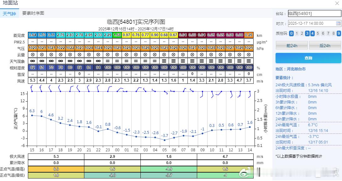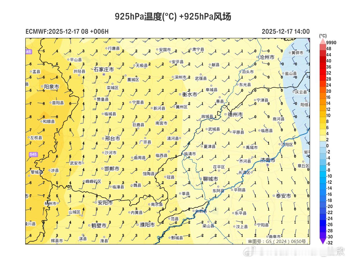 【雾】今天14时在河北和山东交界一带的雾在减少,但没有彻底消散。河北临西14时能见度257米,山东临清429米,还有浓雾。这一带低空存在逆温(临西14时地面2米气温为1.6℃,数值预报反演的925百帕温度在2-3℃,比地面附近略高),使得雾持续时间很长。