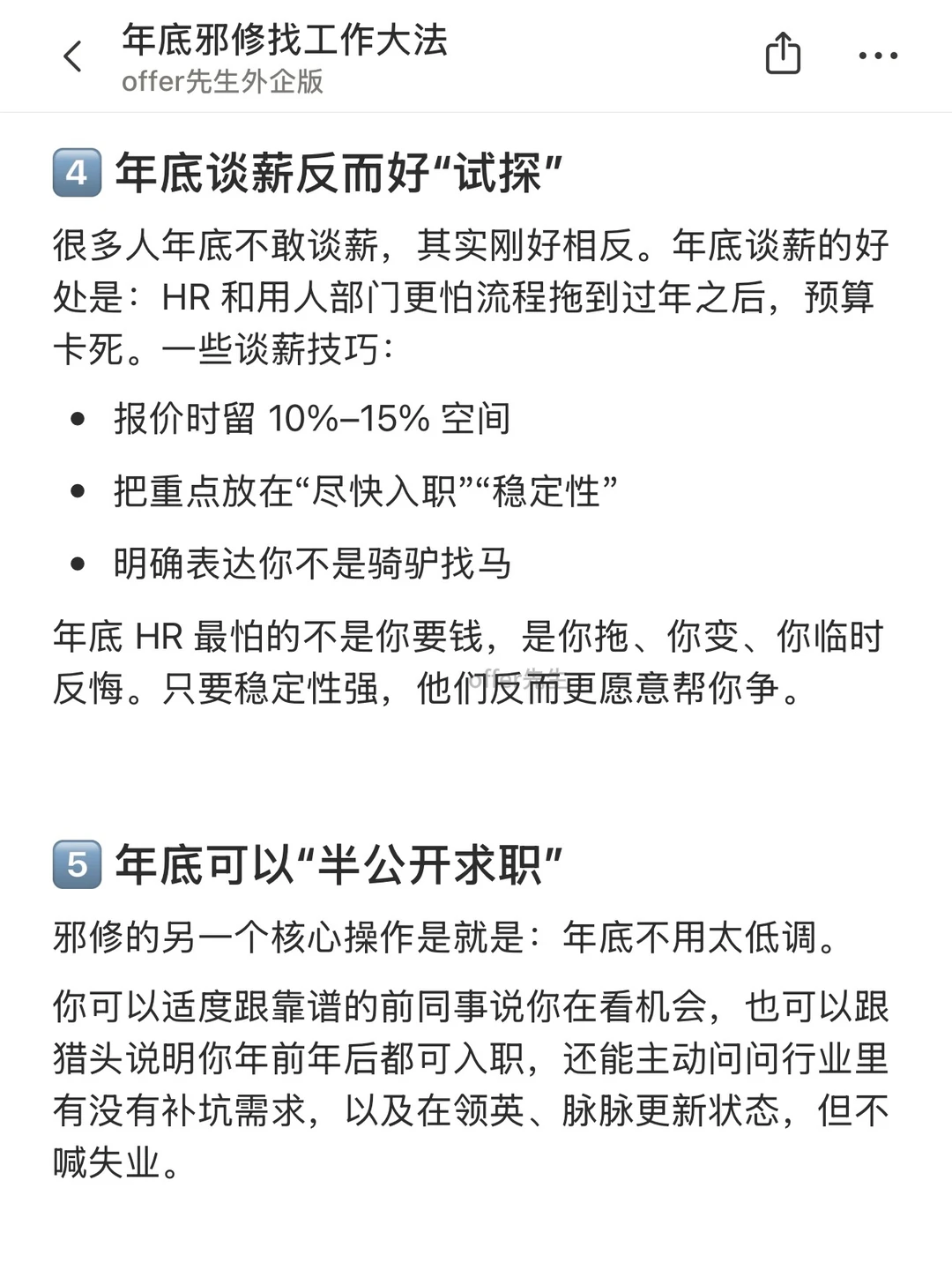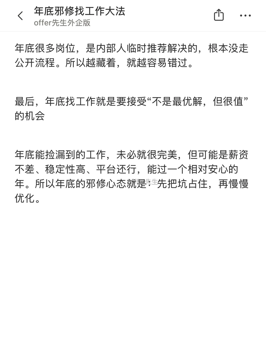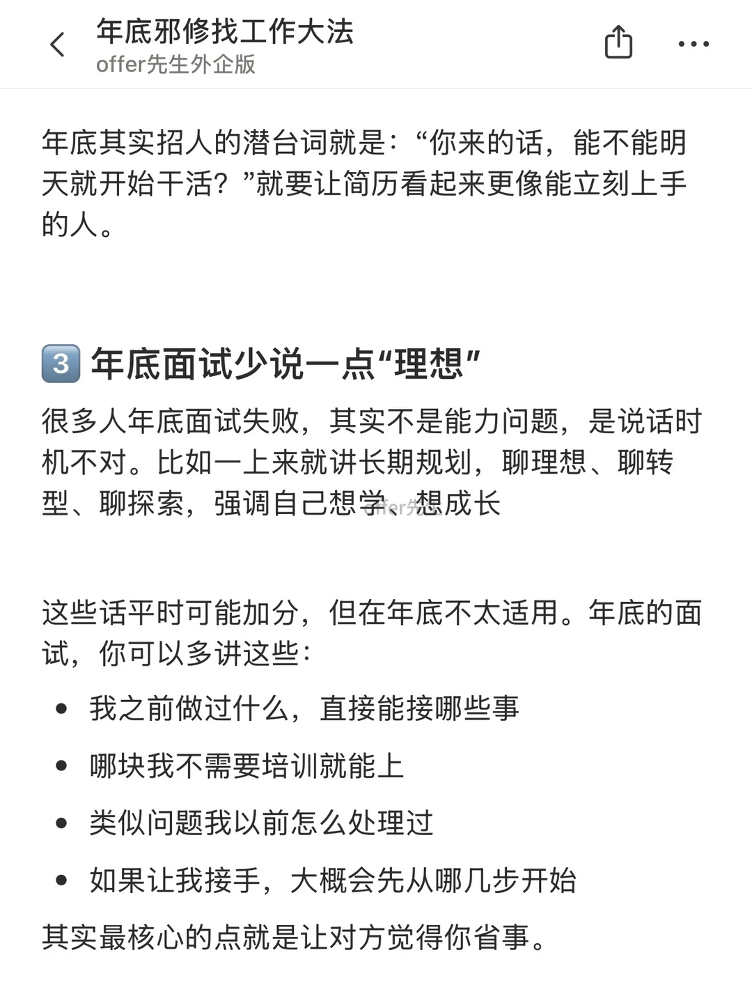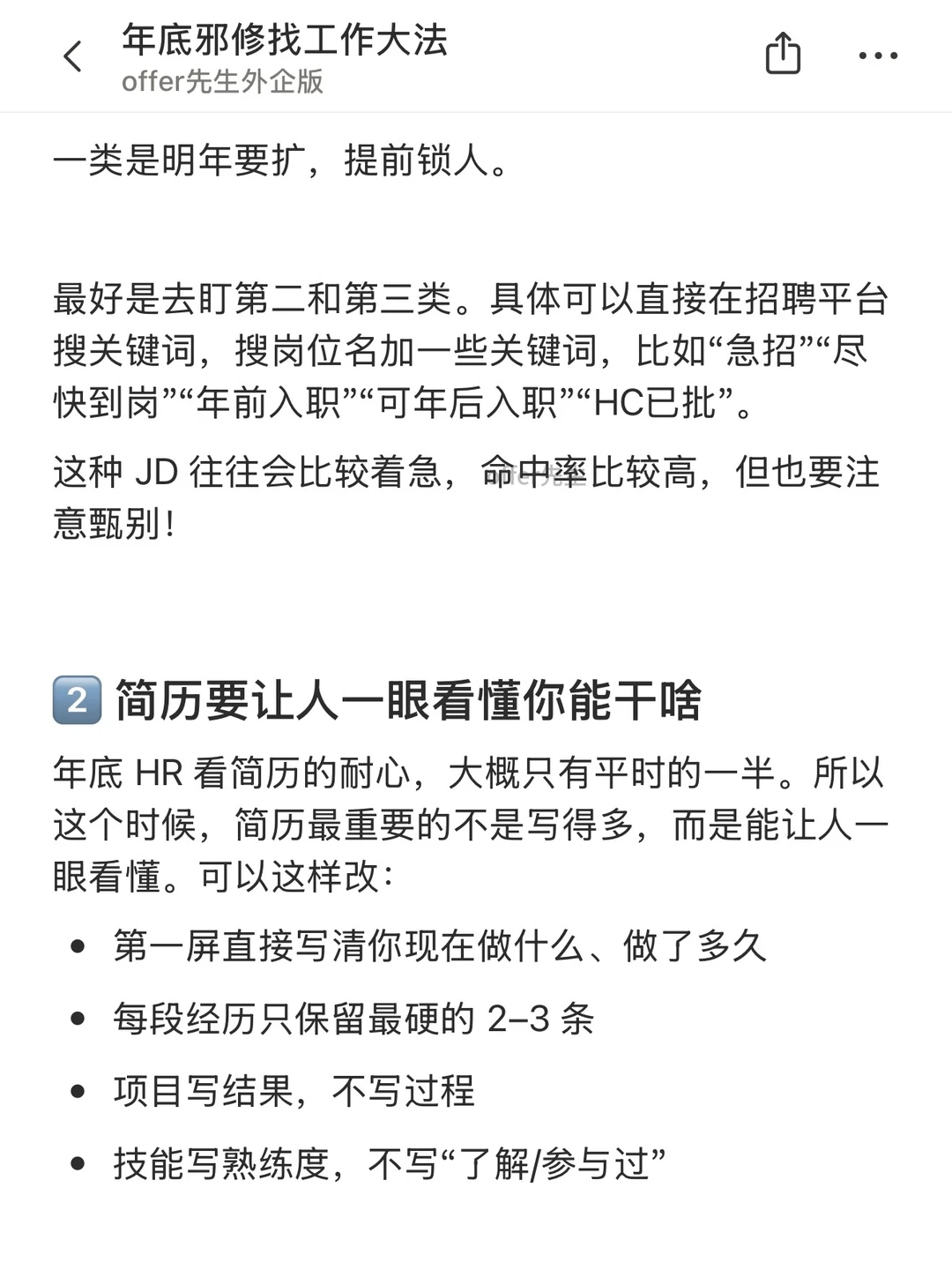 年底找工作,老老实实反而不占优势。因为年底的招聘逻辑,本来就跟旺季不一样。这时候真不建议还按标准流程一步一步来,邪修反而有用。 . 所谓“邪修”,其实就是绕开人最多、最卷的路径,用更省力的方式拿结果。 . 一个认真分享“找工作”干货的账号。真诚、有料、不说空话,只想用真实经历、具体方法,帮大家少走点弯路 .