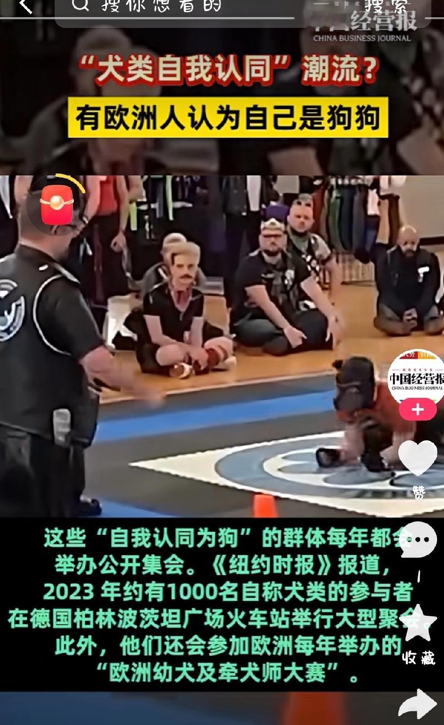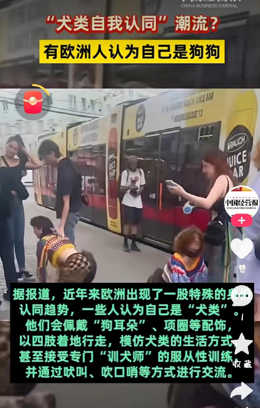 这是吃饱了撑得吧?欧洲出现新潮流,人把自己当成狗,不仅“戴狗耳朵”还模仿狗的生活!太疯狂了 刚刚刷到了一则视频,视频报道近年来欧洲出现了一种新潮流,那就是一些人自认为自己是犬,他们不仅佩戴“狗耳朵”,项圈,就连生活方式,四肢走路,都要模仿狗狗!惊呆了,他们的交流方式都成了吠叫! 真的颠覆三观,这到底是怎样一种荒诞的现象啊!在视频里,那些“扮狗人”穿梭在城市的角落,在公园里像狗一样嬉戏、打滚,全然不顾旁人异样的眼光。有人还专门为自己打造狗窝,睡在里面才觉得踏实。 据说,这种潮流还催生了相关的社交活动。他们会组织聚会,一群“狗狗”聚在一起,用吠叫和肢体动作交流,仿佛真的进入了犬类的世界。对此你怎么看???