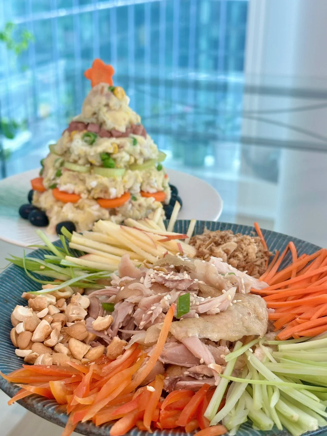 🍗盐焗捞鸡(盐焗鸡搭配彩椒胡萝卜芹菜苹果丝,以及坚果和红葱碎即可)