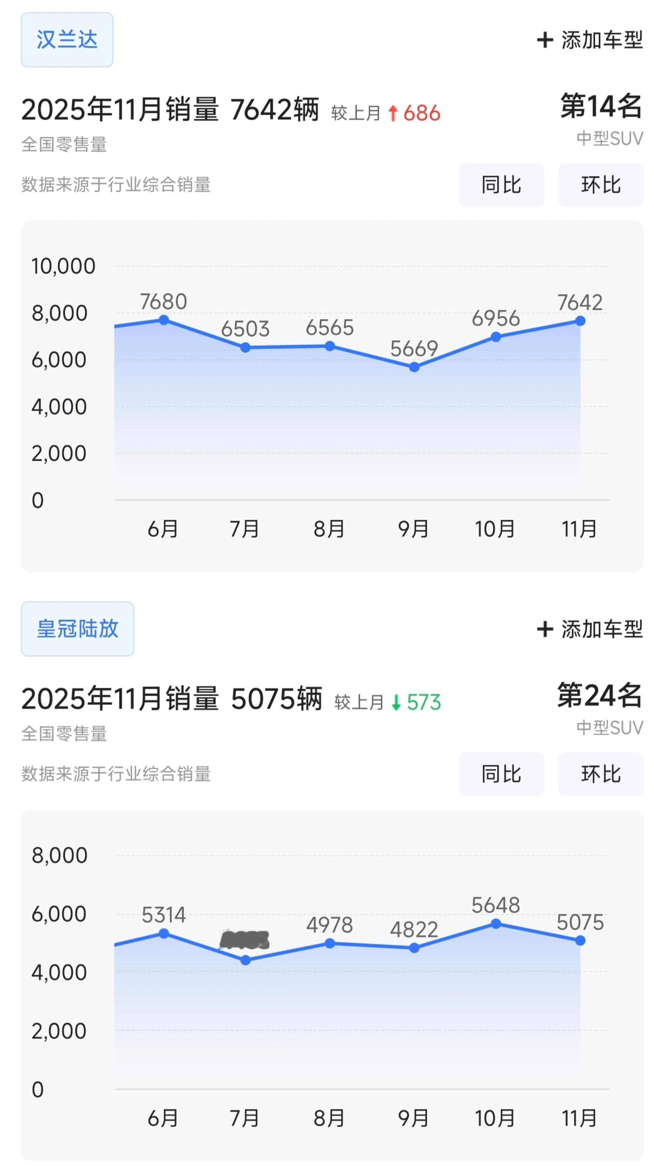 很久没关注过汉兰达了,我发现汉兰达+陆放这俩车一个月还能卖出1万多台,而且销量极其稳定虽然现在降价优惠幅度不小,但毕竟还是20多万的产品,如今二三十万价位的SUV市场已经卷疯了,汉兰达陆放还能卖这么好,挺让我意外的。另外不得不服,汉兰达保值率依然出奇的高,五年保值率67%,六七年的上一代汉兰达还在15万附近,太保值了...