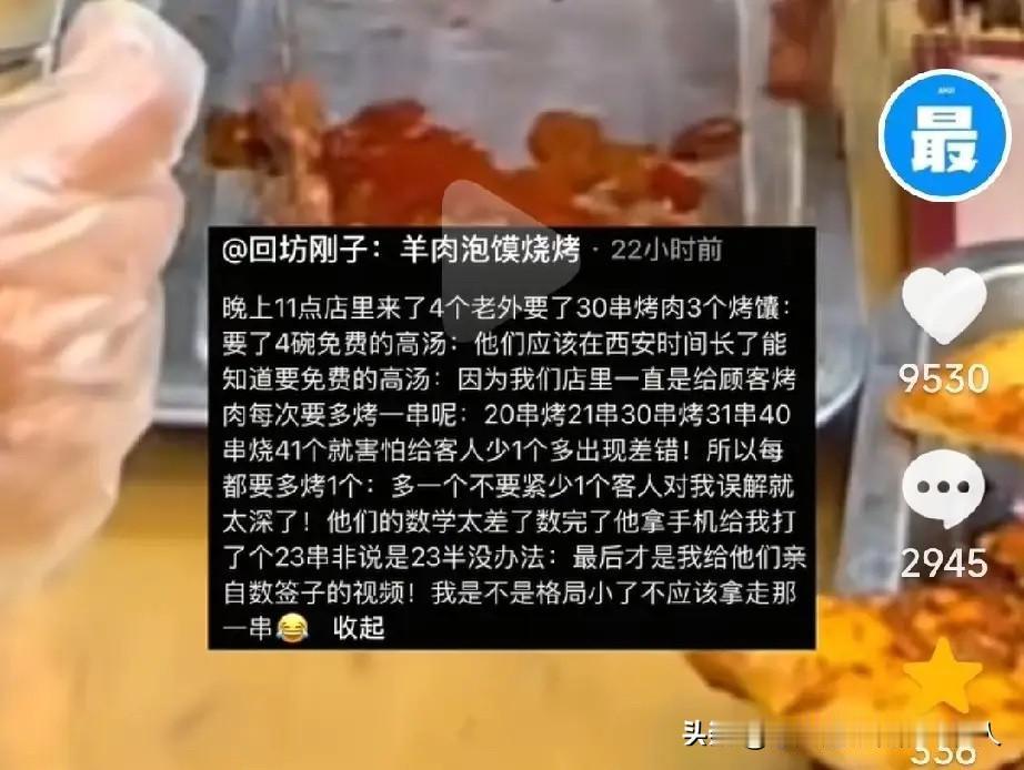 笑不活了!西安一家烧烤店,四个印度留学生点了30串烤肉、三个馕,还端了4碗免费高汤。 菜刚上齐,他们就找老板,说烤串少了,只有23串。老板却特有底气,因为店里有个规矩:怕数错让顾客难堪,每次都会多烤一串。他当场掏出手机拍视频,当着留学生的面一串一串数,数完整整31串,不仅没少还多了一串!老板二话不说,把多的那串拿走了,留下几个留学生面面相觑。 老板事后吐槽,这几个人都知道蹭免费高汤,看着在西安待挺久了,咋还这么不会算数?他还调侃自己是不是格局小了,不该拿走那串。 网友都直呼老板干得漂亮,说要是不找事,多给一串没啥;敢找麻烦,宁可拿走喂狗也不给。在我看来,数数本来就是常识,这事儿跟国籍没关系,故意找茬就不该惯着。老板有理有据的做法,既没吃亏也没失风度,实在太解气了!