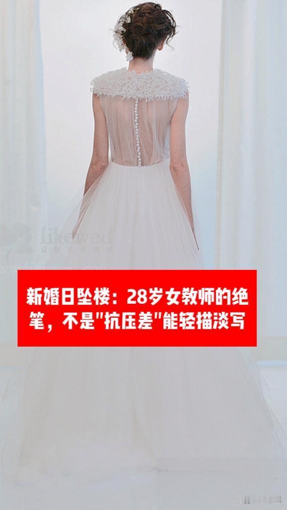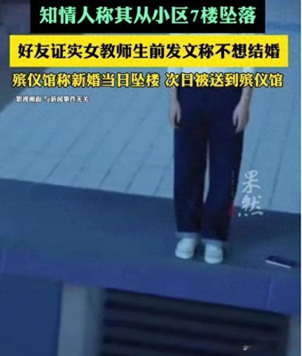 红嫁衣变寿衣?28岁高中女教师新婚当天坠楼,最后朋友圈撕开残酷真相 谁能想到,本该满是祝福的新婚之日,会变成一场天人永隔的悲剧?河南鲁山这位28岁的高中女教师,穿着喜庆的红嫁衣,却从7楼纵身一跃,让本该热闹的婚礼现场,瞬间被悲伤笼罩。 据小区住户爆料,12月10日上午9点多,急促的警笛声打破了小区的宁静,起初大家以为是邻里纠纷,直到业主群里传来“新娘坠楼了”的消息,才知道出了大事。这位“95后”历史老师,有着令人羡慕的编制工作,在当地最好的高中任教,学生们都记得她温和善良的模样。可谁也不知道,这个在课堂上讲授自由与平等的姑娘,自己却早已深陷困境。 转折点来得猝不及防,她生前最后一条朋友圈截图曝光,字字泣血。原来这场婚姻根本不是她想要的,11年里她一次次对抗父母的相亲安排,可换来的却是父母以死相逼、亲戚指责不孝。她口中“蹬鼻子上脸”的对象,配上“只会让她忍着”的父母,成了压垮她的最后一根稻草。更让人揪心的是,她坠楼后,双方家属竟因“嫁出去的女儿泼出去的水”和“未完全过门”互相推诿,遗体晾了一天才被送到殡仪馆。 28岁,本该是人生最好的年纪,她却用最决绝的方式逃离。课堂上她教学生们反抗封建糟粕,自己却没能挣脱原生家庭的枷锁;她劝学生珍惜生命,自己却被逼到无路可退。婚姻本该是避风港,不是完成任务的KPI;父母的爱该是后盾,不是绑架的枷锁。 每个看似平静的崩溃背后,都藏着无数次无声的求救。如果有人愿意听她倾诉,如果父母能多些理解,如果婚姻能少点功利,这场悲剧或许就能避免。愿天堂没有逼婚,没有勉强,也愿每个年轻人都能被尊重选择,愿每段婚姻都始于真心,而非妥协。你怎么看待这场令人心碎的悲剧?欢迎在评论区聊聊你的看法。新婚跳楼 女孩坠楼现场 坠楼少女