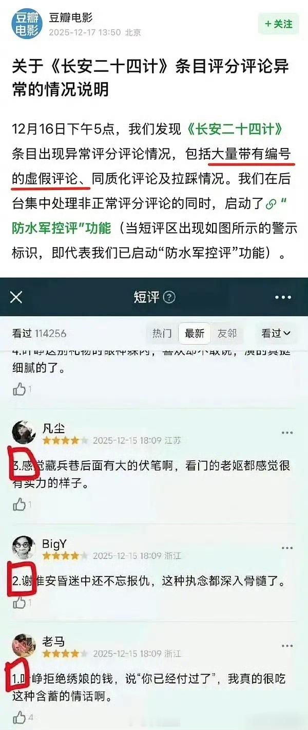 豆瓣公告清理长安二十四计异常短评情况说明:共处理非正常短评46491条,其中五星短评30857条,四星短评1426条,三星短评6条,二星短评600条,一星短评13602条;处理长评660条…正主太废,粉丝太蠢。内娱乐子 豆瓣回应长安二十四计异常情况