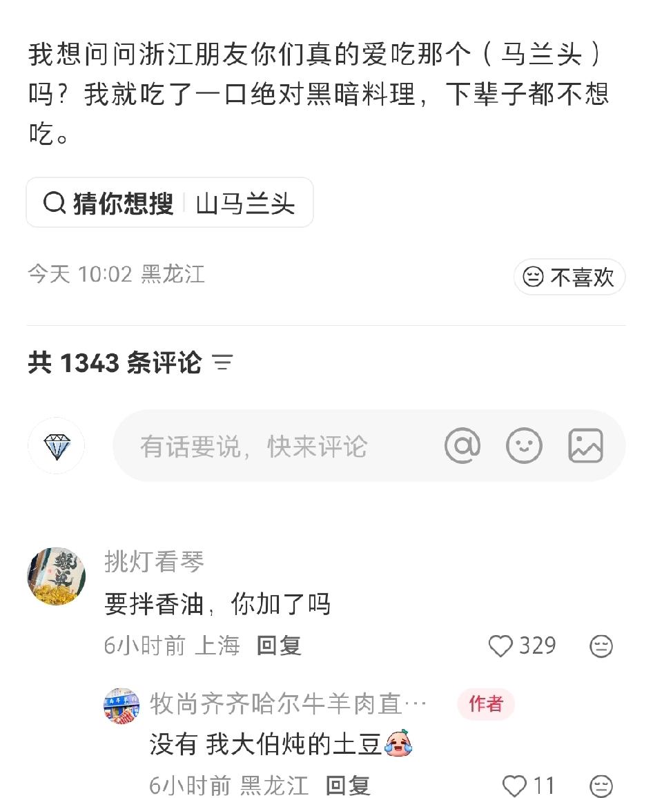 马兰头炖土豆,第一次听说。 看到一位黑龙江的网友质疑浙江网友吃马兰头,认为马兰头绝对是黑暗料理,并发誓这辈子绝对不再吃。 我还觉得奇怪,马兰头这么清爽的菜,也没啥异味,不爱吃的真的很少见,怎么就黑暗料理了? 结果这位网友说他家是马兰头炖土豆,我估计马兰头也没焯水,那肯定难吃了。