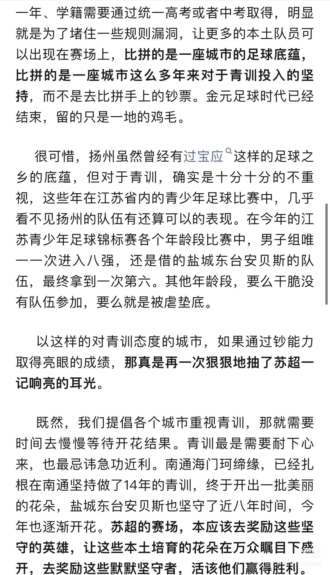 网传苏超扬州队打算买下山东泰山部分青训球员,为明年的苏超坐准备。 这件事网上争论很大,反对者认为这丧失了苏超的本质,跟金元足球没多大区别,也不利于本地青训的培养。 我倒绝对这是好事情,对于足校来说来了一笔可观的收入,对于球员来说,增加了比赛机会,对于球迷来说有了主队的比赛看,我觉得算是三赢。