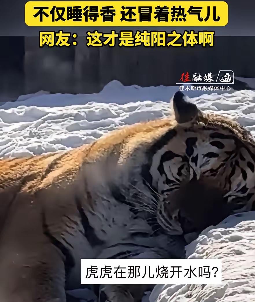 黑龙江牡丹江,一女子去动物园看东北虎,刚好发现有一只在睡觉,有意思的是,这只老虎就躺在雪地里,不仅睡得香,浑身更是散发着热气。这道理其实不复杂,东北虎作为长期生活在寒温带的动物,它的生存装备是刻在基因里的。一身厚实的长毛,尤其是腹部和颈部的毛发格外浓密,相当于自带一件高级羽绒服。这身皮毛不仅保暖,还能在雪地里成为天然的伪装 再加上它们体型大,新陈代谢旺盛,就像一台持续运转的暖炉,产生的体热足以对抗外界的严寒。 有网友表示:纯阳之体你以为是开玩笑哪!鹿血和鹿肉也是大补之物,人要是喝鹿血一小杯都受不了,老虎一次吃一只鹿都没事,你还敢跟它比。 这身皮毛可不简单,科研人员做过实验,一根虎毛的保暖效果能顶三根羊毛,更妙的是,毛色变浅后,在雪地里就成了天然伪装,既保暖又隐蔽,真是大自然给的“智能外套”。 最让人佩服的是东北虎的“节能智慧”,冬天一来,它们就变得特别“懒”,能趴着绝不站着,能躺着绝不趴着。有经验的猎人都知道,看见雪地里一动不动的老虎,那不是在偷懒,而是在“省电”,它们甚至会故意在雪地里打滚,压出一个雪窝子,这个自制的“雪屋”既能挡风又能保温。 对此大家怎么看呢