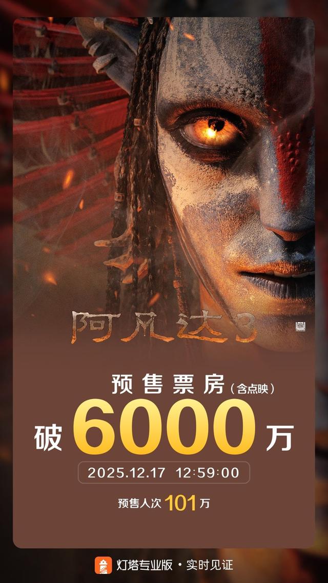 由詹姆斯·卡梅隆导演的《阿凡达:火与烬》(以下简称《阿凡达3》)将于12月19日登陆全国院线。据灯塔专业版数据,截至12月17日12时59分,《阿凡达3》点映及预售票房破6000万元,而2022年12月10日《阿凡达2》(《阿凡达:水之道》)预售开启4日后,点映及预售票房已破1亿元,12月15日上映前6时预售票房更是突破2亿元。