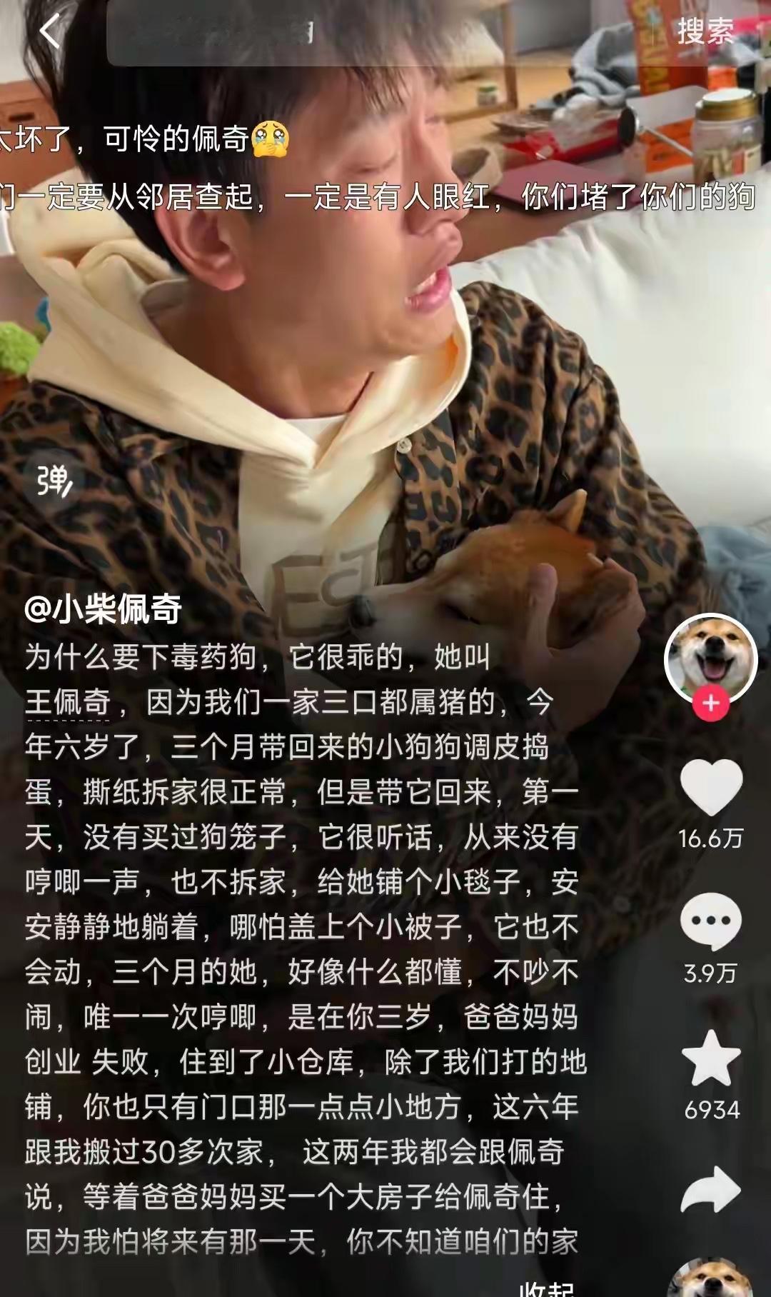 12月17日,博主“小柴佩奇”在自己账号上发布噩耗,自己家的网红柴犬“佩奇”在山东老家被毒死,死状凄惨。它疼得在地上疯狂打滚,嗷嗷乱叫,那叫声凄厉得让人头皮发麻,到最后更是疼得把自己的舌头都咬出了血,鲜血流在地上,看得人心脏都揪成一团,没一会儿就没了气息。女主人在视频眼睁睁看着它从活泼的样子变得毫无生气,一遍遍地自责,说是不是不结婚,不来山东,不度蜜月,佩奇就不会死。 有网友表示:不一定是中毒,再说现在去哪儿买那么多毒药?狗发脑炎和中毒症状一样,到处乱窜,抽搐吐白沫,发作到死亡就一会儿的事,根本就不给救治时间,所以养狗最好打脑炎疫苗。 农村有吃了老鼠药的死老鼠,狗是不是吃了这个,还有,就算是投毒,投毒的人总不能把毒药投到他家去把,这也侧面说明了他没有把自己的狗栓绳和带嘴笼子。 理解主人悲哀,有感情但更重要的是失去赚钱工具,但是像现在这种舆论,爱宠者不规范自己行为必然遭到反噬。 人的生死有定数,狗的生命也一样,如果有缘,它一定会以另外一种生命重新投胎到你们身边的。福兮祸兮祸兮福以兮。 对此大家怎么看呢