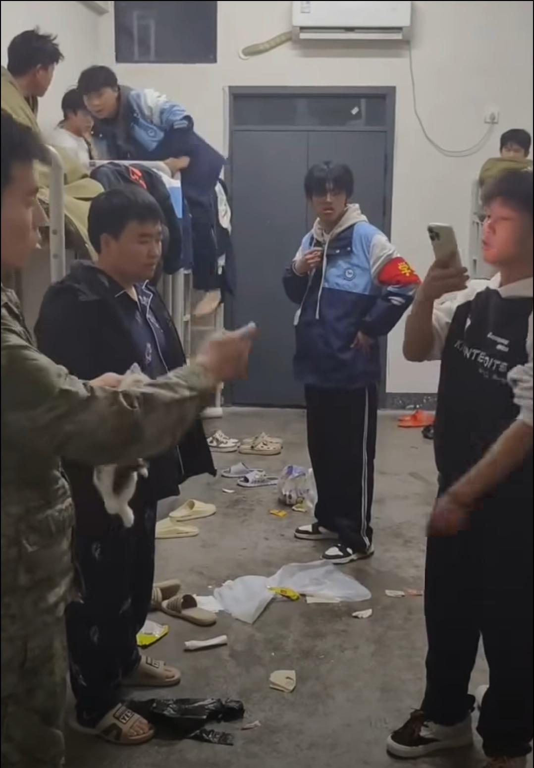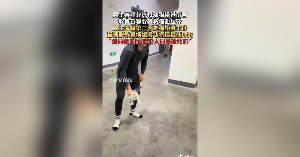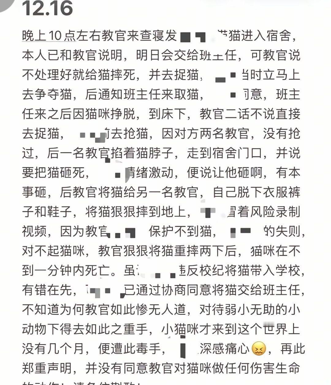 湖南教官摔猫全过程,究竟谁对谁错? 2025年12月15日晚,湖南湘西为民职业技术学校两名寝室管理人员查寝时,在某男生宿舍发现一只违规饲养的幼猫。养猫学生称,已与查寝人员协商一致,约定次日由班主任前来接收并妥善安置,当时班主任已到场将猫接过手。 协商后,幼猫因受惊挣脱躲藏,一名男性查寝人员情绪失控。现场视频显示,该人员将猫捉出后,不顾学生阻拦,脱下外衣,先后两次将幼猫狠狠摔向地面。目击者证实,第二次摔击力度极大,幼猫当场失去生命体征,随后被丢弃至垃圾桶。 事件视频在网络传播后引发热议。涉事人员社交账号显示,其自称“协助管理寝室的人”,并非教官,不仅未致歉,还抱怨“因视频被网暴”,称“谁养的都不敢承认,怪得了谁”,社交备注写有“纵千夫所指,吾何惧之”。 12月16日,涉事学校确认事件存在,初期称“学生同意处理猫”,该说法与学生证言及现场视频相悖。同日,湘西当地教体局回应称已启动专项调查,明确表示“禁止任何形式的动物虐待行为”,相关责任人将依规处理。 截至发稿,涉事人员尚未向养猫学生正式致歉,学校与教体局的调查仍在进行中,具体处置结果将另行公布。 ------------------------------------ 学生的错,不过教官也有点冲动。 杀生不虐杀,虽然教官并没有虐猫,但是当众摔死还是不太好。 建议下次把猫带走,然后私下无害化处理就好了,这样没有视频流出,就没有舆论风波了。