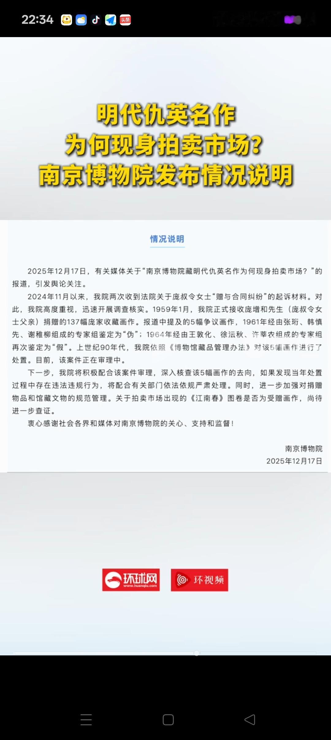 南京博物院这次尴尬了! 估价8800万元的捐赠古画准备拍卖,却被捐赠人后人发现了!一查才知道,原来当初捐赠的137幅画作,有5件都不知去向。 南京博物院的最新消息是,1959年收到了庞先生捐赠的137幅古画,但1961年,1964年,有5幅古画被鉴定为“假”的,所以处置了。具体去了哪里,也没有说明。 更没想到的是,庞家的后人还拿出了当时的捐赠票据,写的清清楚楚。 就像很多网友说的那样,如果当时鉴定捐赠的古画是“假”的,应该及时通知他们,让他们来取。 现在南京博物院应该尽快公布那5件捐赠古画的去处,再核实估价8800万的那幅画是哪里来的! 消息来源于环球网,封面新闻。。