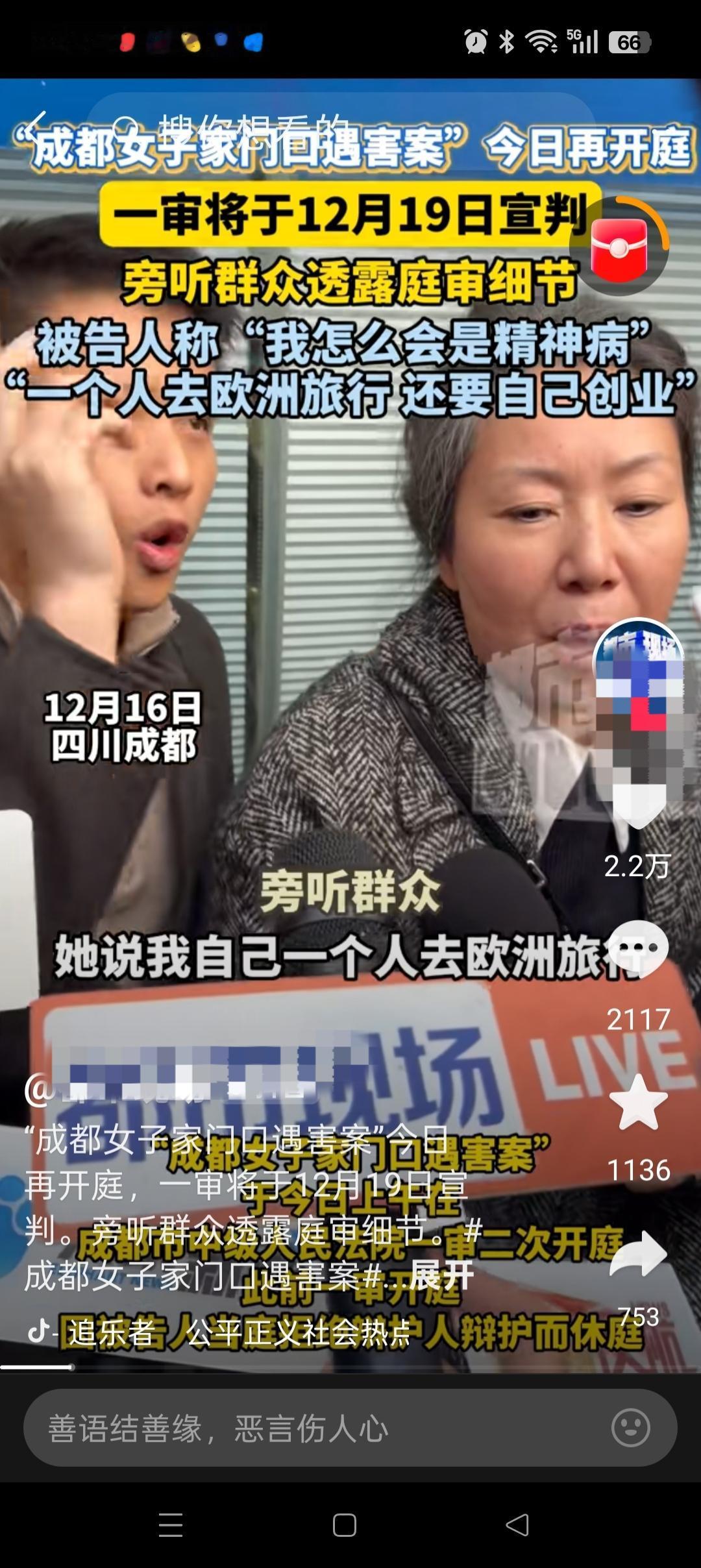 成都女子家门口遇害,她妈妈眼神坚定,紧握拳头,高呼:我只接受一个结果,那就是立刻执行。如果一审不行,那就二审,一直到最高院。她凭什么?我不能让她得逞,这是我作为妈妈的力量 还有一个旁听的热心群众,出来后也怒了,那女的居然当庭说:自己一个人去过欧洲旅行,以前还在深圳工作,正准备创业,我怎么可能是精神病。 看到妈妈还有这样的斗志,我就真的放心了。因为这件事,肯定不是一两天的事,需要慢慢熬,还要有强大的内心支撑。 现在看来,她的内心足够强大,她的那一句“这就是妈妈的力量”喊出了多少父母的心声啊! 祝她早日得到自己想要的结果,加油[玫瑰][玫瑰]