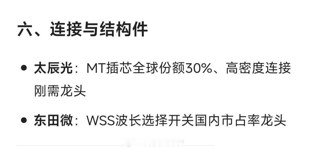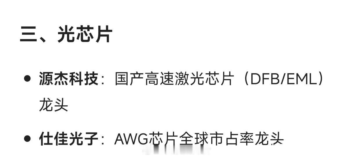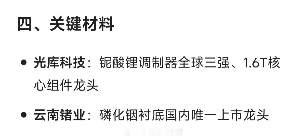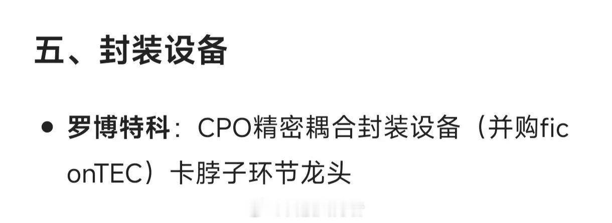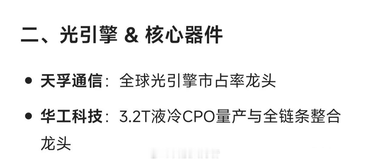 CPO(共封装光学)概念龙头企业汇总一、光模块整机• 中际旭创:全球800G/1.6T光模块出货量领跑,在超高速光模块领域占据核心地位。• 新易盛:北美云巨头800G光模块的主力供应商,深度绑定头部客户需求。二、光引擎 & 核心器件• 天孚通信:全球光引擎市占率领先,为CPO提供关键集成组件支持。• 华工科技:率先实现3.2T液冷CPO量产,具备全链条整合能力,技术落地进度领先。三、光芯片• 源杰科技:国产高速激光芯片(DFB/EML)龙头,填补国内技术空白,支撑CPO高速传输需求。• 仕佳光子:AWG芯片全球市占率居前,为CPO信号分合路提供核心器件。四、关键材料• 光库科技:铌酸锂调制器全球三强,1.6T核心组件技术成熟,是CPO高速信号处理的关键支撑。• 云南锗业:国内唯一上市的磷化铟衬底龙头,为光芯片制造提供核心材料保障。五、封装设备• 罗博特科:通过并购ficonTEC,掌握CPO精密耦合封装设备核心技术,突破卡脖子环节。六、连接与结构件• 太辰光:MT插芯全球份额达30%,高密度连接方案是CPO集成的刚需支撑。• 东田微:WSS波长选择开关国内市占率领先,保障CPO光路动态调控能力。这些企业覆盖CPO产业链从核心器件到封装、材料的全环节,构成了当前技术突破与量产落地的主力阵营。