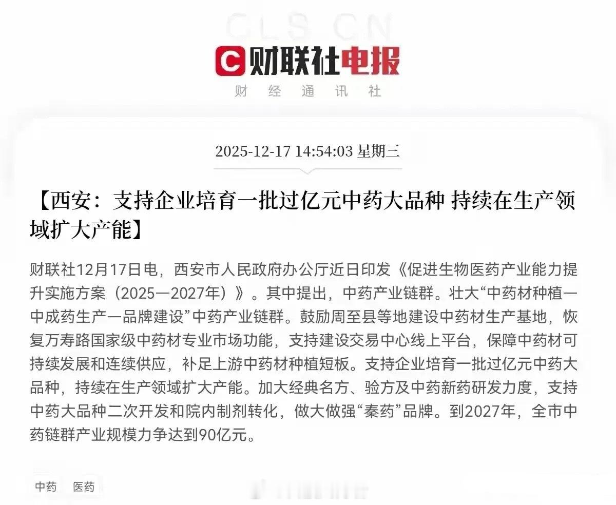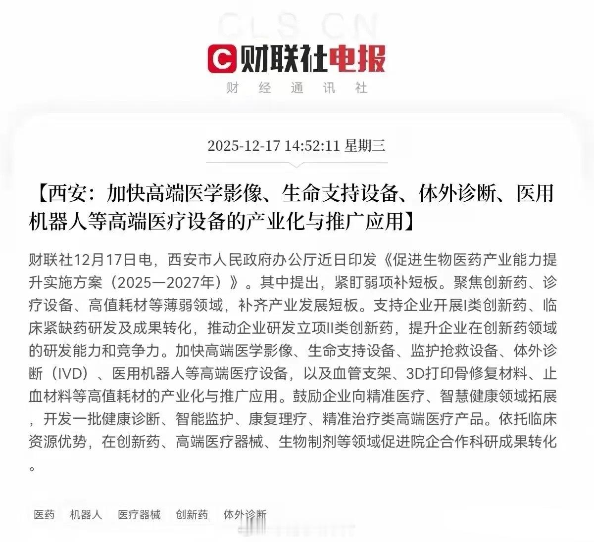 西安生物医药新政落地,三大赛道迎重磅利好!西安市发布《促进生物医药产业能力提升实施方案(2025—2027年)》,明确聚焦化药生物药、高端医疗设备、中药三大产业链群,目标2027年化药生物药链群规模达120亿元、中药链群达90亿元。政策重点发力仿制药研发(新增16个产品)、创新药IND申报、高端医疗设备(医学影像、医用机器人等)及高值耗材产业化,同时培育亿元级中药大品种、做强“秦药”品牌,强化产学研转化。核心受益概念股解析1. 化药生物药链群◦ 恒瑞医药:化药创新龙头,仿创结合布局肝靶向、多肽药物,创新药IND申报能力贴合政策方向。◦ 药明康德:CXO全链条服务龙头,助力肝靶向、干细胞外泌体等创新药研发转化,为产业链核心支撑。◦ 智飞生物:生物药(疫苗)龙头,创新研发能力可推动细胞新药IND申报,契合生物药规模扩张目标。◦ 凯莱英:CDMO领域标杆,在多肽、肝靶向药研发生产上技术突出,加速仿制药与创新药落地。2. 高端医疗设备及耗材◦ 迈瑞医疗:高端医疗设备龙头,医学影像、生命支持设备覆盖政策重点推广范畴,西北市场拓展空间广阔。◦ 联影医疗:医学影像设备(CT、MRI)龙头,为高端设备产业化核心标的,院企合作加速成果转化。◦ 鱼跃医疗:布局生命支持、医用机器人配件研发,贴合政策对智能医疗设备的推广需求。◦ 乐普医疗:心血管高值耗材龙头,血管支架等产品属政策推广范畴,创新药研发同步契合化药赛道。◦ 健帆生物:血液净化高值耗材企业,精准医疗布局贴合智慧健康方向,直接受益耗材产业化政策。◦ 赛微电子:MEMS芯片核心供应商,为医用机器人、医疗影像设备提供关键元器件,赋能设备国产化。3. 中药链群◦ 片仔癀:中药龙头,亿元级大品种培育经验丰富,经典名方研发能力助力“秦药”品牌建设。◦ 同仁堂:百年品牌,擅长经典名方与院内制剂转化,契合中药“种植-生产-品牌”全链条发展。◦ 以岭药业:中药创新标杆,多个亿元大品种加持,中药新药研发贴合二次开发政策。◦ 天士力:中药现代化龙头,大品种培育与产能扩张经验丰富,助力“秦药”做强。◦ 东阿阿胶:拥有“种植-生产”完整产业链,产能扩张方向匹配中药产能提升要求。总结政策精准锁定三大赛道,龙头企业凭借技术、产能与产业链协同优势将率先承接红利。化药生物药领域看创新研发与IND申报进度,高端医疗设备聚焦国产化与市场拓展,中药板块则需关注大品种培育与品牌联动。后续政策落地后的产能兑现、研发突破,将成为相关个股的核心驱动逻辑。(本文资讯来自网络,不构成投资建议)