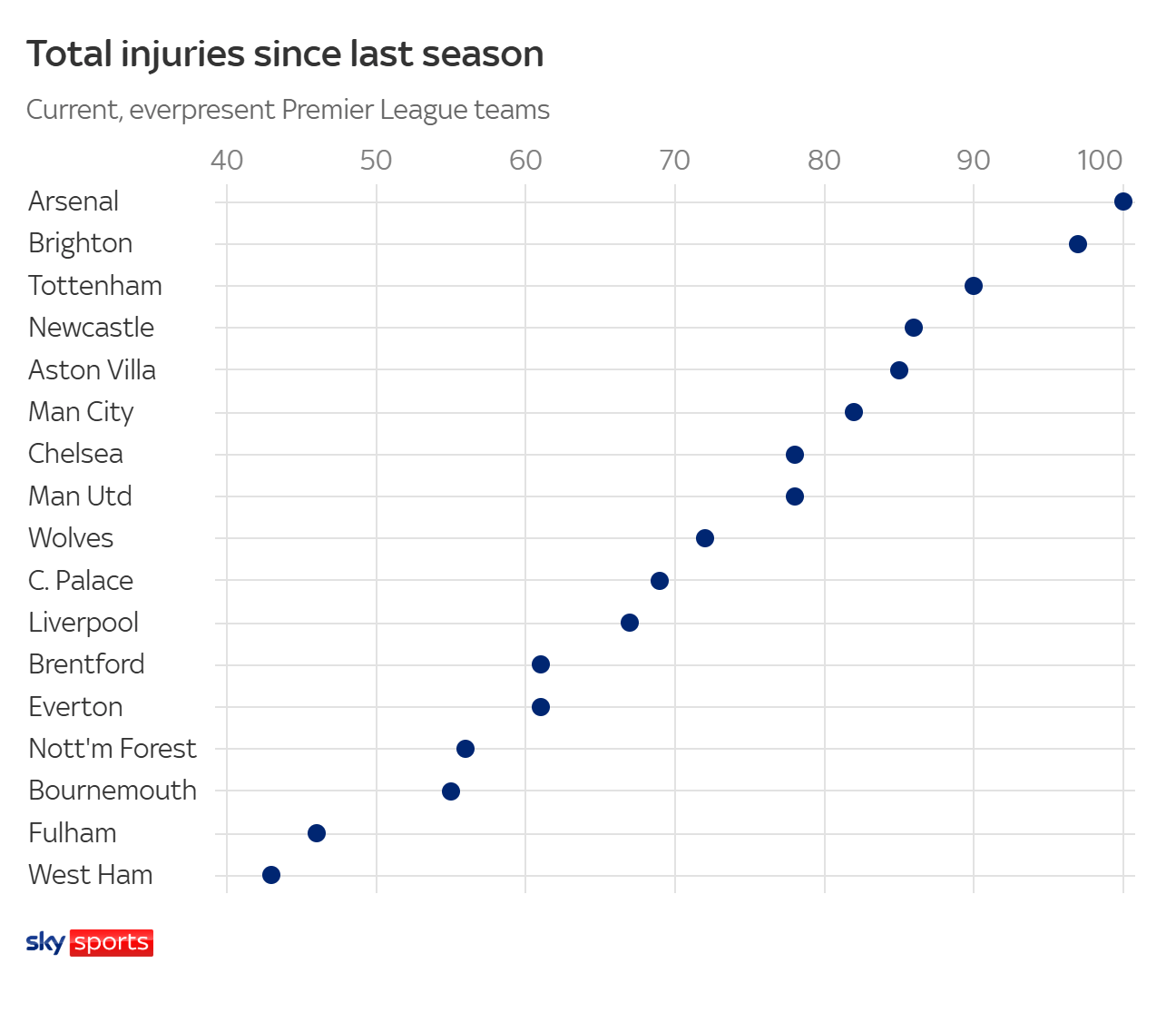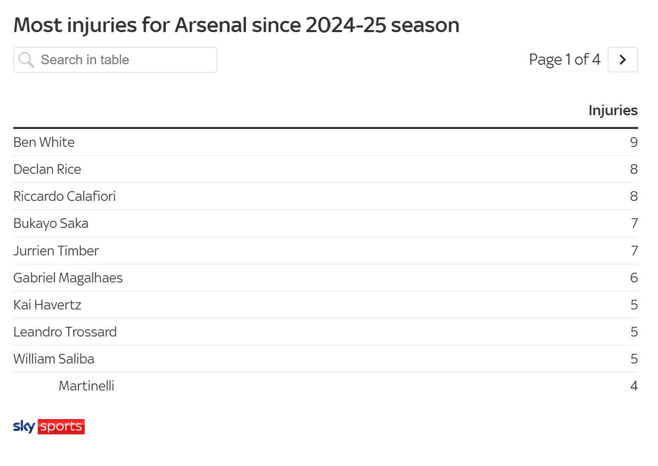 据英国媒体《天空体育》统计,这一数字让阿森纳成为过去两个赛季中英超首支伤病次数“破百”的球队,目前在英超伤病榜上排名首位。紧随其后的是布莱顿(97次)和热刺(90次)。阿森纳自2024/25赛季开始以来,已经累计遭遇100次不同伤病情况,成为近两个赛季英超联赛中伤病次数最多的球队。