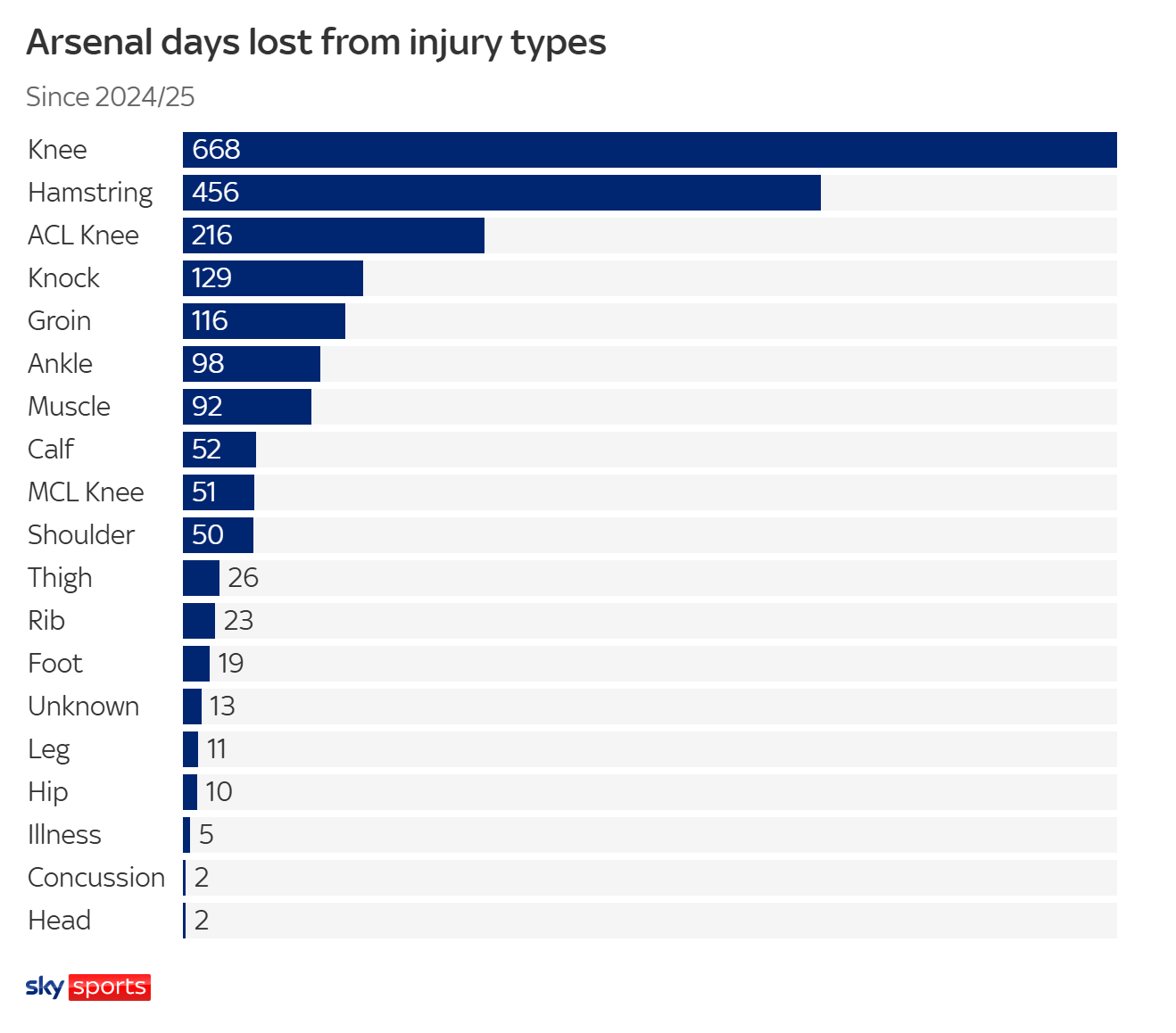 从伤病类型来看,膝盖伤势对阿森纳影响最大,自2024年8月以来已导致球员累计缺席668天。此外,腿筋伤病造成458天缺阵,而ACL伤病(单独统计)也导致了216天的缺席时间。
