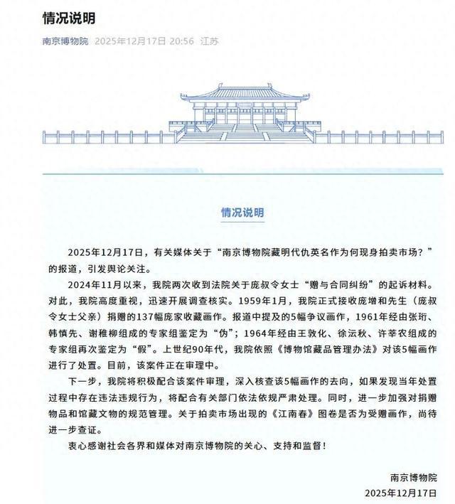 下一步,我院将积极配合该案件审理,深入核查该5幅画作的去向,如果发现当年处置过程中存在违法违规行为,将配合有关部门依法依规严肃处理。同时,进一步加强对捐赠物品和馆藏文物的规范管理。关于拍卖市场出现的《江南春》图卷是否为受赠画作,尚待进一步查证。