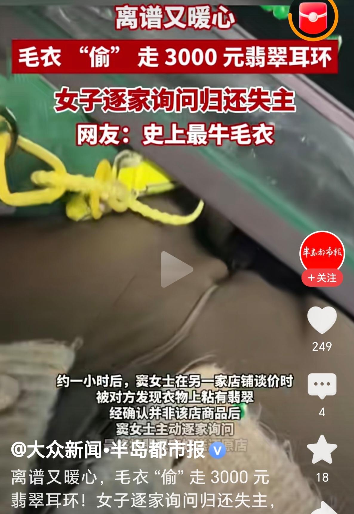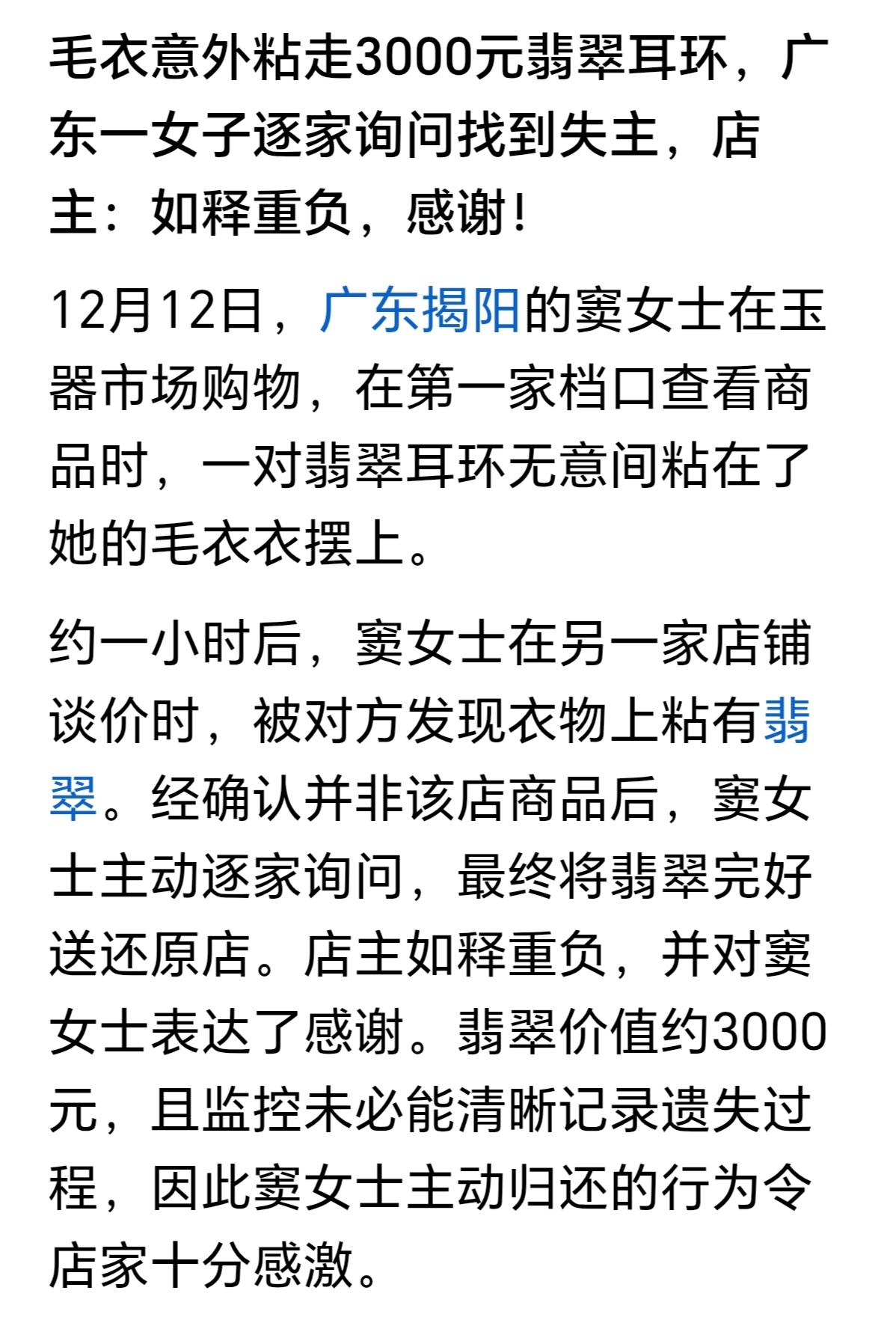 换个角度来看,如果有监控监控到了是她粘走了翡翠,而她又是在不知情的情况下,在路上丢了,当警方察看了监控,通过大数据找到了她,并要求她归还。她由于是在不知情的的情况下粘走了翡翠,又在不知情的情况下丢了,肯定不会承认曾经有过这么一回事,商家为此将她告上了法庭,法庭是不是判她归还翡翠?因为,无论你是不是知情,但翡翠是在你身上丢失的,这是事实,她是不是负有赔偿责任?