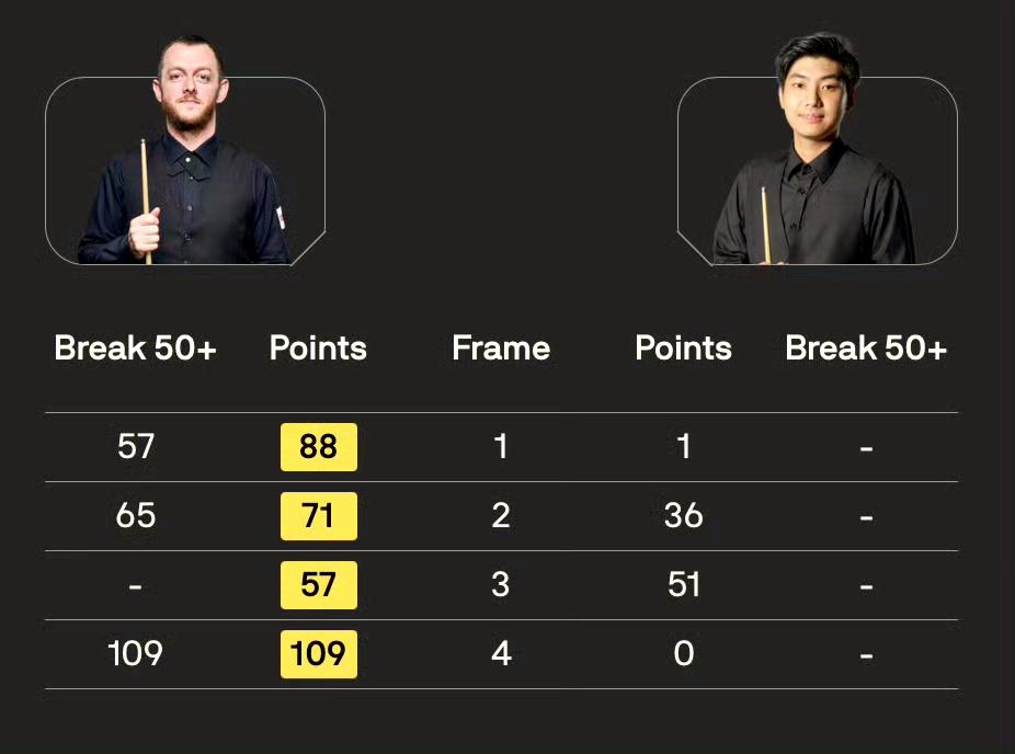 全场比赛,艾伦打出单杆109分和两杆50+(57、65),他连下四局4-0战胜王雨晨晋级。他将在下一场对战张安达。