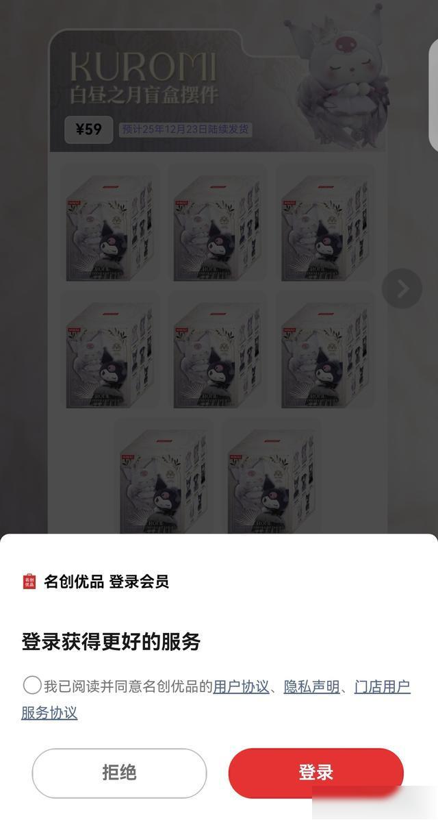 记者随后在名创优品线上小程序上进行操作,使用手机号注册登录后,可以正常选购盲盒进行购买,但如果退出登陆后,在购买时会弹出登陆会员窗口,如果点击拒绝,则无法进行正常购买。