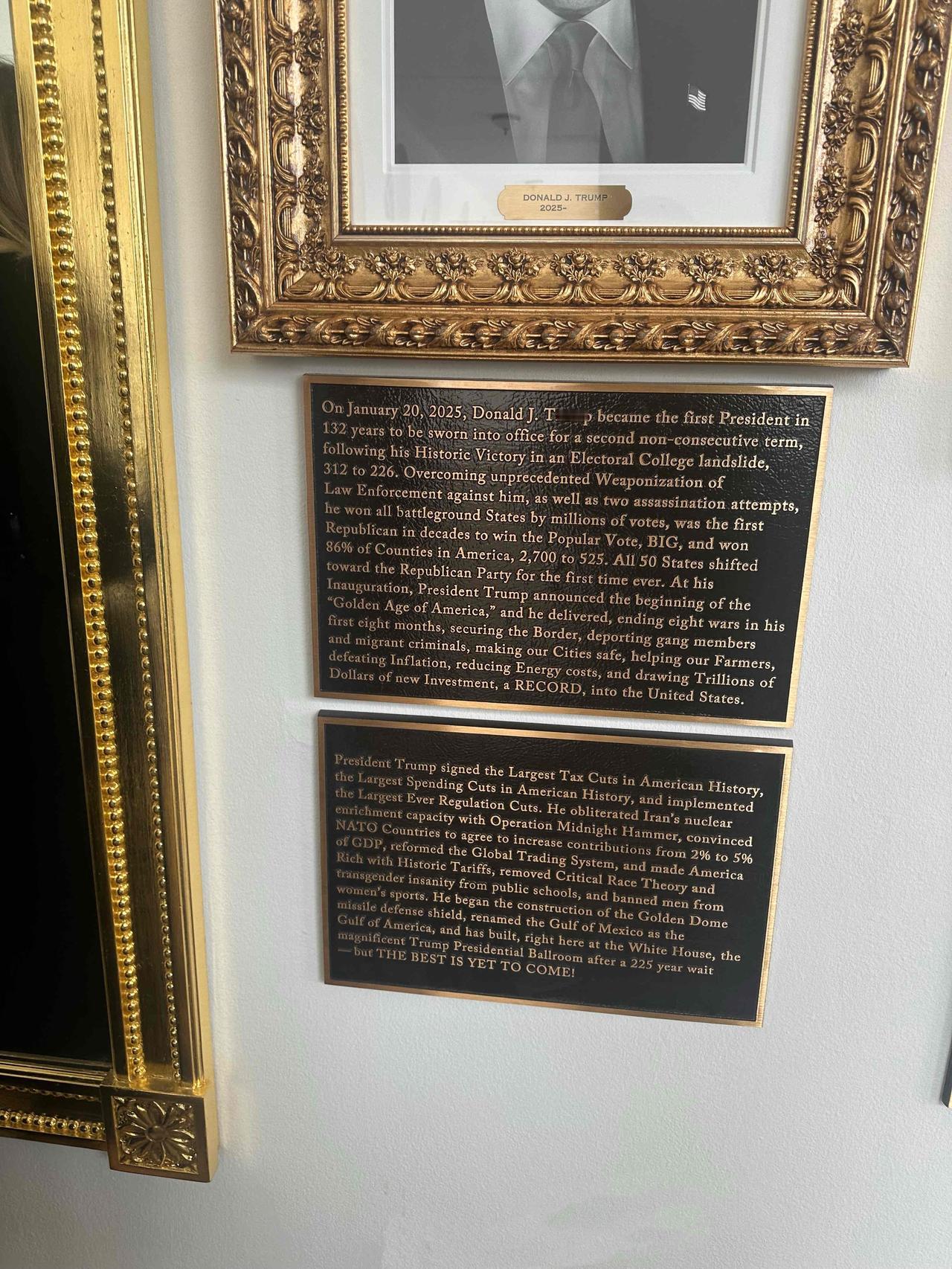 白宫总统星光大道铭文添加 特朗普第二任期铭文: 2025 年1月20日,唐纳德·J·特朗普成为132年来首位宣誓就职的非连任总统,他在选举人团投票中以312票对226票的历史性胜利当选;尽管面临前所未有的执法部门武器化针对以及两次暗杀企图,他仍以数百万票的优势赢得所有摇摆州,成为数十年来首位在普选中大获全胜的共和党人,并赢得全美86%的县、即2700县对525县;美国所有50个州首次全部转向共和党。 在就职典礼上,特朗普总统宣布“美国黄金时代”的开始,并兑现了承诺,在其上任的头八个月里结束了八场战争,确保了边境安全,驱逐了帮派成员和非法移民罪犯,让我们的城市变得安全,帮助了我们的农民,击败了通货膨胀,降低了能源成本,并吸引了创纪录的数万亿美元新投资进入美国。 特朗普总统签署了美国历史上规模最大的减税法案、美国历史上规模最大的削减开支法案,并实施了有史以来规模最大的削减监管措施;他通过“午夜锤击行动”摧毁了伊朗的核浓缩能力,说服北约国家同意将贡献比例从国内生产总值的2%提高到5%;改革了全球贸易体系,并通过历史性关税使美国变得富有,将批判性种族理论和跨性别疯狂从公立学校清除,并禁止男性参加女子体育运动;他开始建造金顶导弹防御系统,将墨西哥湾更名为美国湾,并在白宫这里,经过225年等待,建成了宏伟的特朗普总统宴会厅——但最好的还在后头!