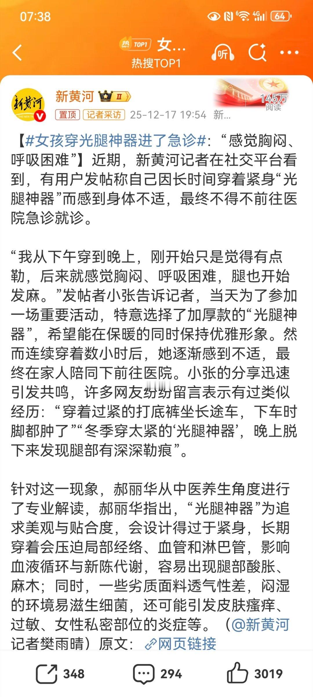 【女孩穿光腿神器进了急诊:“感觉胸闷、呼吸困难”】近期,有网友在社交平台分享因长时间穿着紧身"光腿神器"导致身体不适,最终前往医院急诊就诊的经历。发帖者小张称,从下午穿到晚上后出现胸闷、呼吸困难、腿部发麻等症状。该分享引发众多网友共鸣,不少人表示有过类似经历。专家从中医角度指出,过紧的"光腿神器"会压迫局部经络、血管和淋巴管,影响血液循环,还可能导致皮肤问题。不觉得女孩儿在冬季光腿有什么美感。追求美丽无可厚非,但健康永远是第一位的。光腿神器虽能兼顾温度与风度,但过紧的设计确实存在健康隐患。商家在营销时不应过度强调美观而忽视产品舒适度,消费者也要理性选择,避免盲目跟风。真正的美应该是健康、自信、舒适的状态,而不是以牺牲健康为代价的"美丽"。选择适合自己的保暖方式,才是冬季穿搭的正确打开方式。全网热点共创计划