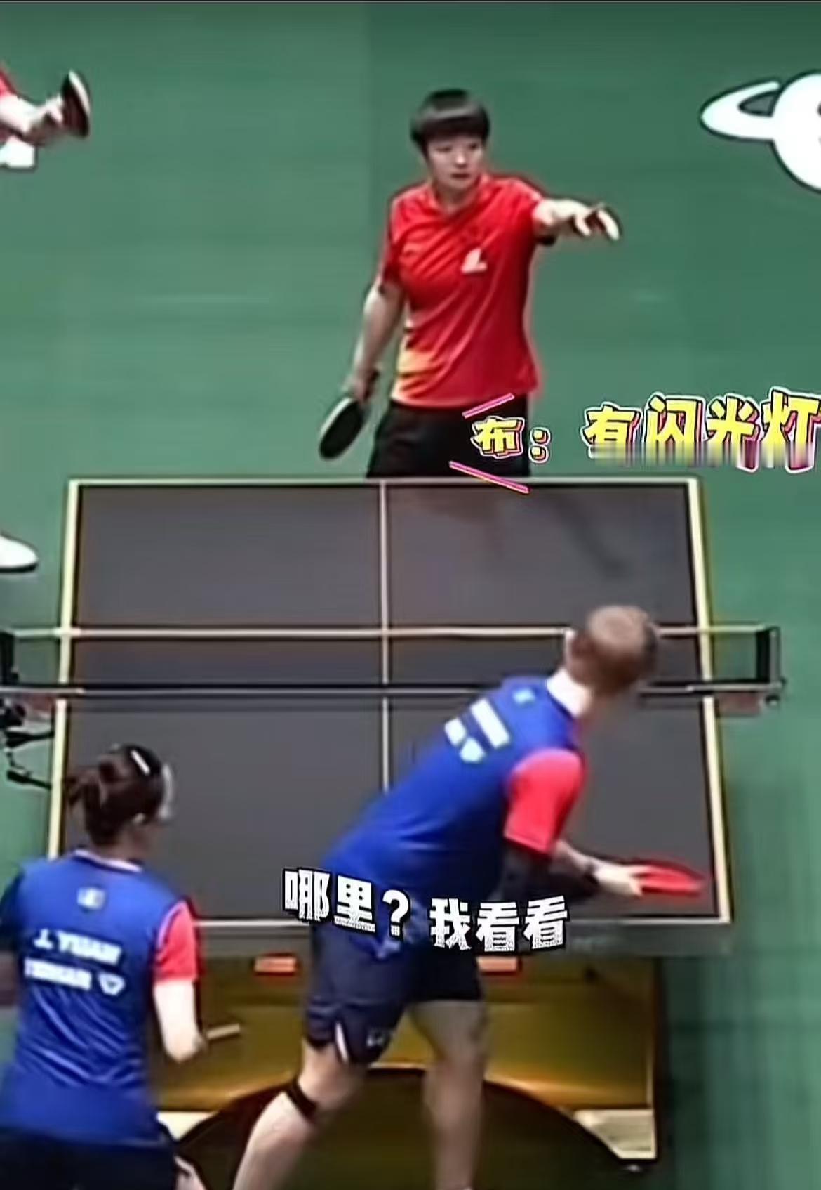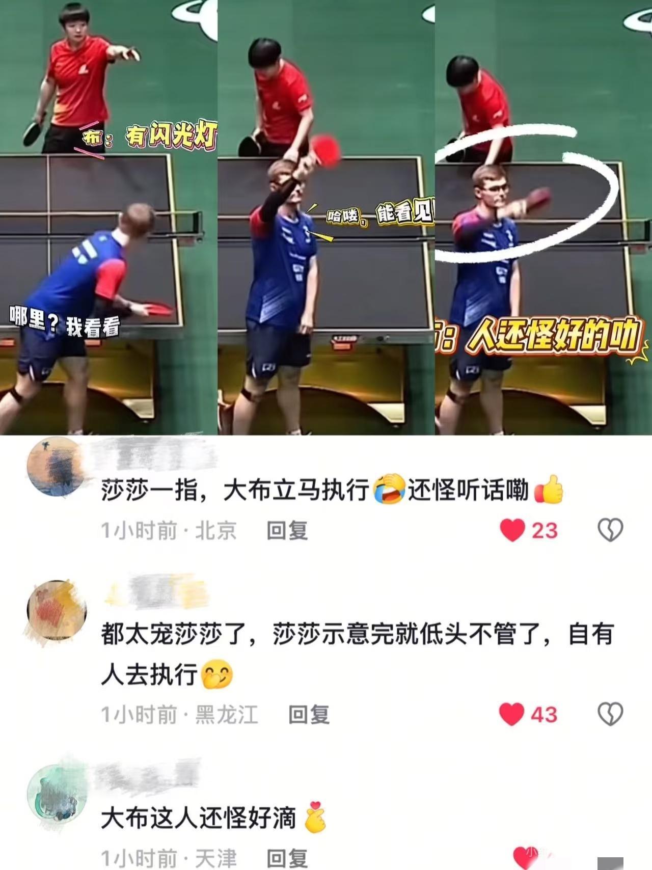 大家都好宠莎莎呀! 混双比赛上,对面莎莎一停顿,扬起手就指着斜上方:“有闪光灯。” 对面的小布,看到莎莎的指示赶紧停下来,也摆手制止。再看看莎莎低头像没事人似的。 大家都太宠莎莎了,她只需要发出指令,剩下的有人帮助做。哈哈。 要知道莎莎在混双上是人气选手哈。
