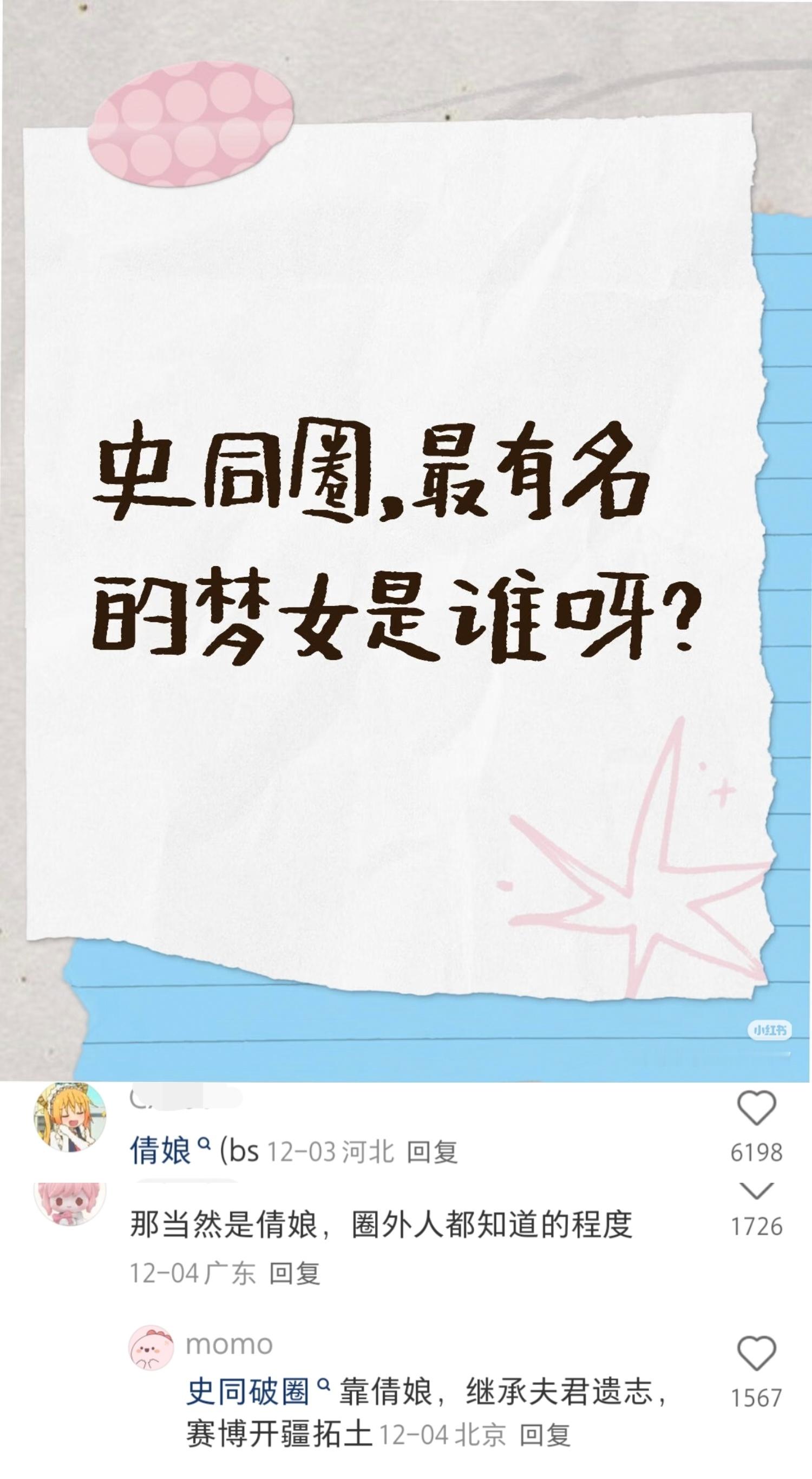 倩娘在史同圈现在已经这么出名了吗…… 之前刷到她还没这么大存在感,现在提到霍去病梦女/史同圈出名的梦女热评都会出现她