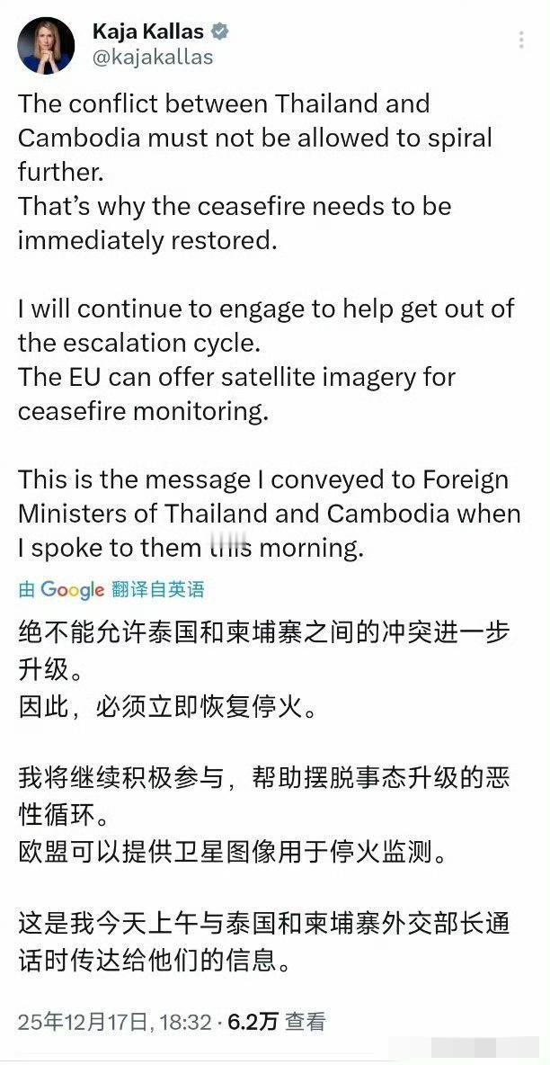 欧盟卡拉斯电话调解柬泰冲突,要求立即停火! 12月17日,欧盟外交与安全政策高级代表卡拉斯发文称:“我今天上午与泰国和柬埔寨外交部长通话时传达给他们的信息。绝不能允许泰国和柬埔寨之间的冲突进一步升级。因此,必须立即恢复停火。我将继续积极参与,帮助摆脱事态升级的恶性循环。欧盟可提供卫星图像用于监督停火。” 卡拉斯还真是自信满满,特朗普都搞不定的事她卡拉斯就行吗?俄乌的事还乱成一锅粥,反倒远隔万里打电话来调解亚洲的事务。是不是手伸的太长了,还是要在亚洲刷一下存在感有别的企图。 亚洲的事亚洲有能力和智慧来解决,还真不劳欧洲费心。只要别人有事欧洲不给添乱就不错了。 目前,俄乌谈判正处于关键时刻,乌克兰将割让领土主权,乌克兰的重建资金还没着落,欧洲经济疲软、社会矛盾尖锐,奉劝她还是先集中精力解决好自己的烂摊子吧,真怕把柬泰冲突调不好再调乱套了,亚洲可不需要这种不合时宜的干涉!