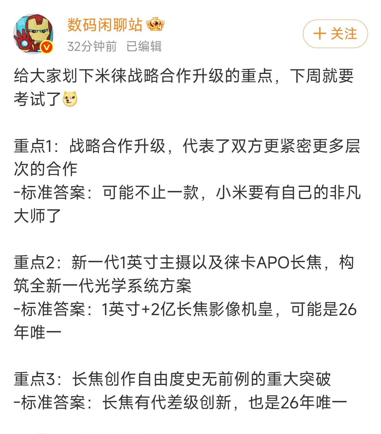 小米和徕卡的合作可以说渐入佳境了,这几年小米移动影像提升巨大,在对光学的理解上,包括对移动影像的理解上可以说层次是高出一层的,再加上徕卡特有的影调,小米影像可以说是一个从“拍”到“说”的过程,说故事,把“人文”拍出来,更具氛围。这次的升级,合作的可能不止一款产品,难道说?有红标版?如果有的话,连同影像套装,水印,都会迎来一个大更新了,我最希望把徕卡的胶片模式加进来,那才够味。而且都说了多层次,那么会不会除了手机外其他品类也有合作的可能?小米17Ultra预热上的划时代光学系统方案,有点期待,实际上小米影像走的路很有个性,如果是1英寸+2亿长焦了,那么有点狠,小米17PM上的lofic高动态技术我觉得效果已经很不错,如果是1英寸的效果,那么估计会更好。小米与徕卡合作升级