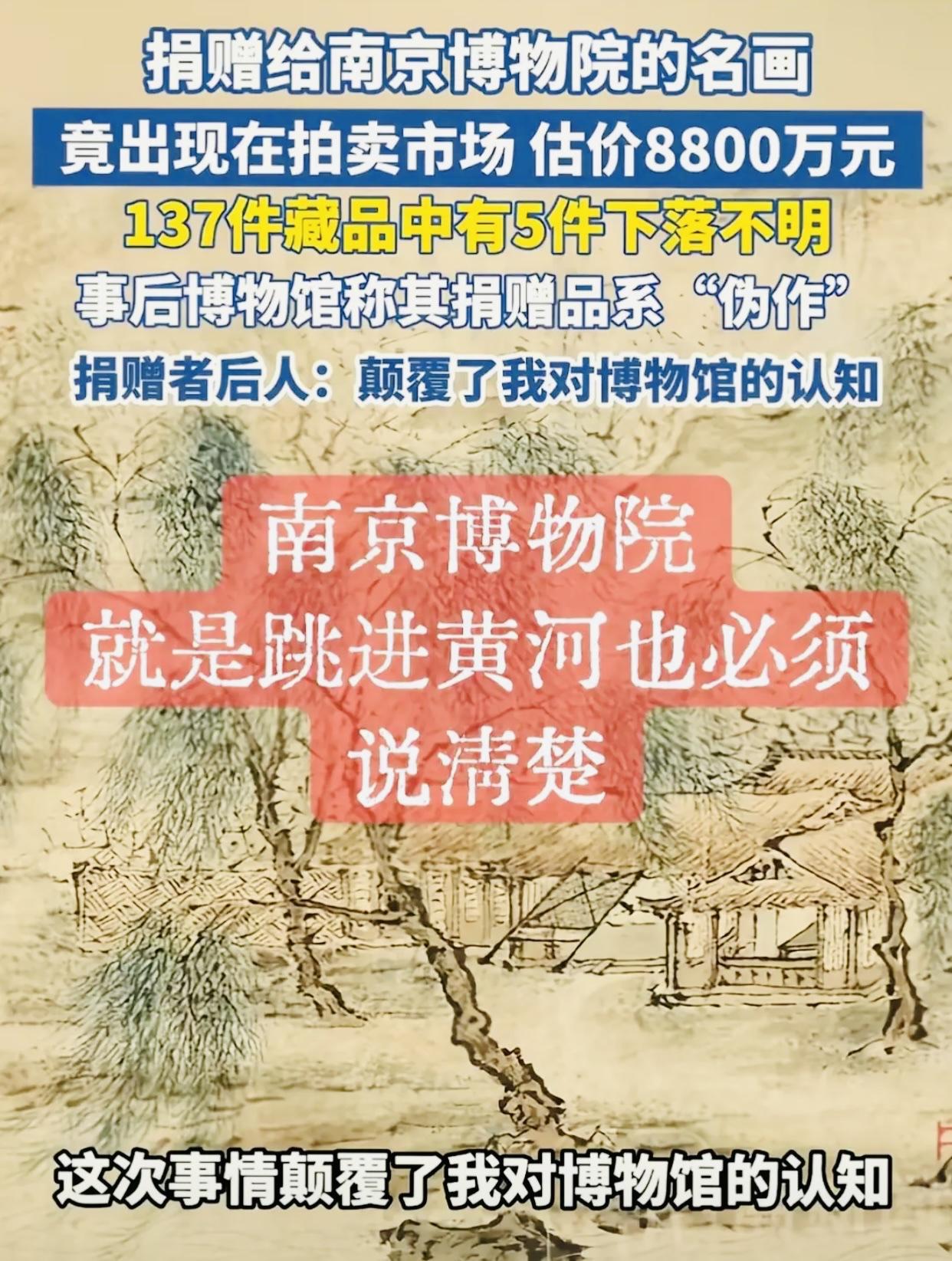 南京博物院这事让人有些不解 1959年庞家捐了137件“虚斋”珍藏,现在一查少了5件,其中仇英《江南春》居然出现在拍卖行,估价直接飙到8800万。 失踪的5件珍藏品,据说经过两次专家验证称为“伪作”,上世纪90年代已处置完毕。 其说法理由不够充分,因为鉴定报告打了马赛克,又拿不出流转证据。 有粉丝对该博物院给予评论,博物院看似平静,实际上在暗流涌动。 大家一致认为庞家不可能捐赠“伪作”,院方将丢失5件珍品说成假的,不过是为自己猫腻找了一个更合适的理由。 幸亏珍品拍卖被庞家后代发现,否则这笔巨款就落在某人手里。 我们都知道,博物院的每件珍品价值连城,不知道还有类似事件没有被发现呢?不知道大家对此怎么看?