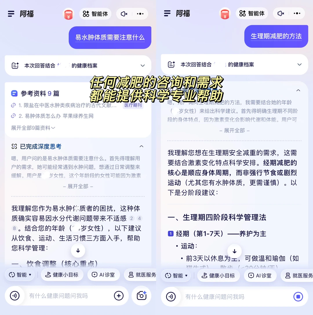 对了,阿福还能随时召唤🧑⚕️的AI分身回答健康问题🙋不管是营养、运动还是体重管理…24h秒回。像我容易水肿,就试着问了问日常调理方法,回答又快又靠谱。突然半夜🕛有个小疑问,随手一查就很安心,再也不用自己胡思乱想或上网乱搜