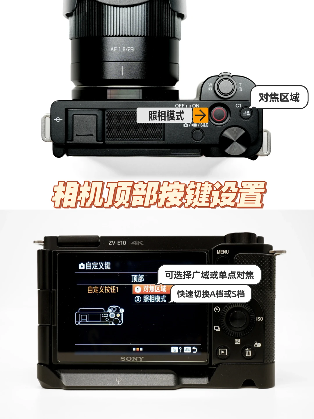 ✅首先我们都知道,Zve10是没有拍照档位切换转盘的,这样我们在档位A/S/M/档来回切换的时候相当繁琐,于适我把『录制键』设置成了『照相模式』按键,使用起来方便多了👉🏻如图2️⃣