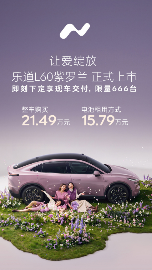 蔚来乐道汽车今日宣布,乐道L60紫罗兰正式上市,整车购买21.49万元,电池租用方式购买15.79万元。