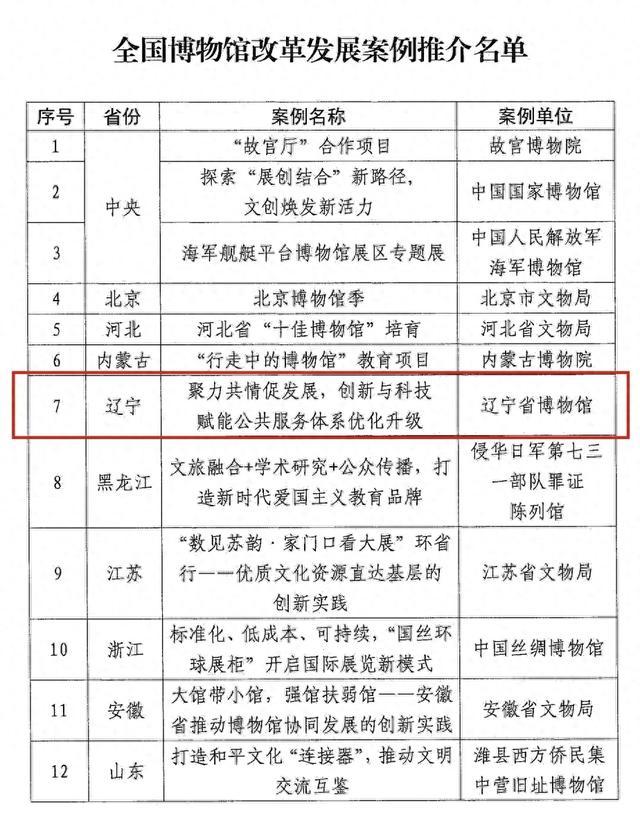 近日,国家文物局公布了全国博物馆改革发展案例推介名单,全国入选20个。辽宁省博物馆“聚力共情促发展,创新与科技赋能公共服务体系优化升级”案例成功入选。