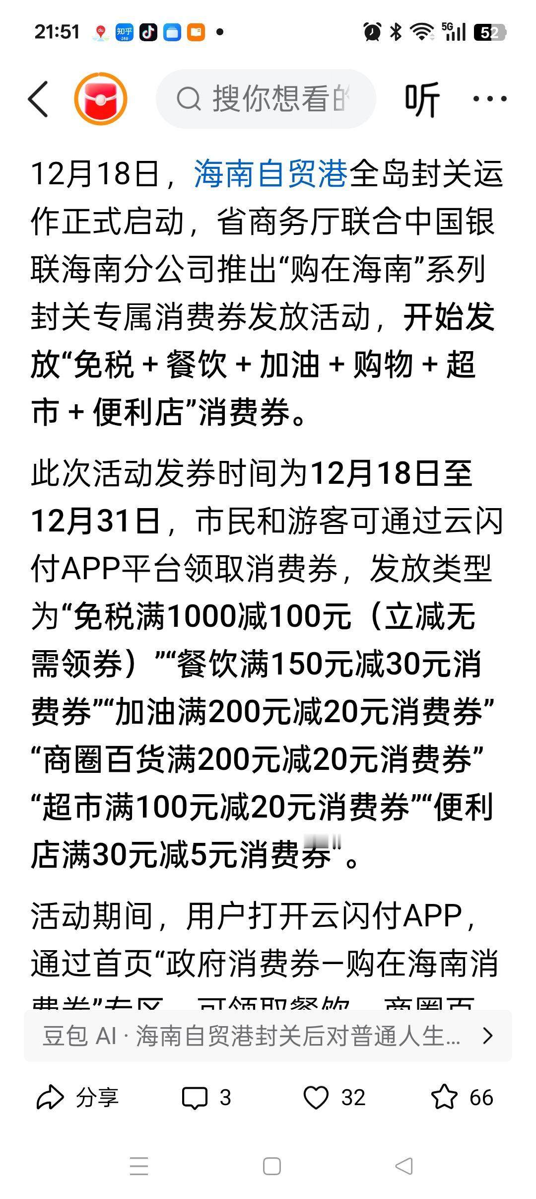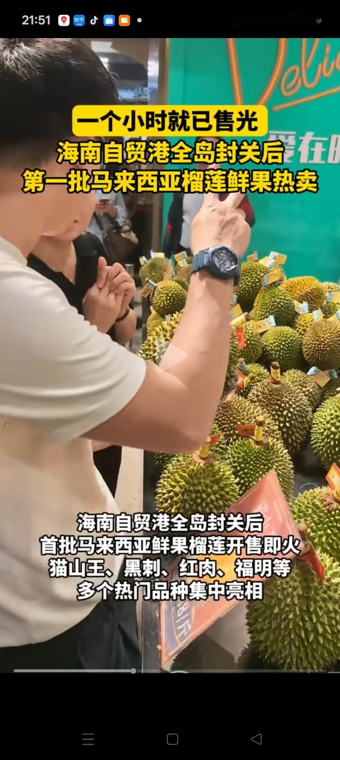海南封关后,当地实打实的3大变化: 1、苹果手机降价了,最高的便宜了2140元。当然大多数都只是便宜了400-700块钱,因为有很多当地发的消费券,可以叠加,所以每款机器减的金额不一样,但已经很幸福了 2、大家正排队买榴莲,便宜了一半!以前舍不得吃的猫山王新鲜榴莲,现在全部安排上了,78-98一斤,依然挡不住大家的热情,排队都不一定买得到。 3、当地正在发放消费券,从电子产品到餐饮,加油,百货,超市,可以说囊括了各行各业。每个家庭都实打实的省了钱,每个人都笑的很开心。 羡慕啊[捂脸][捂脸]