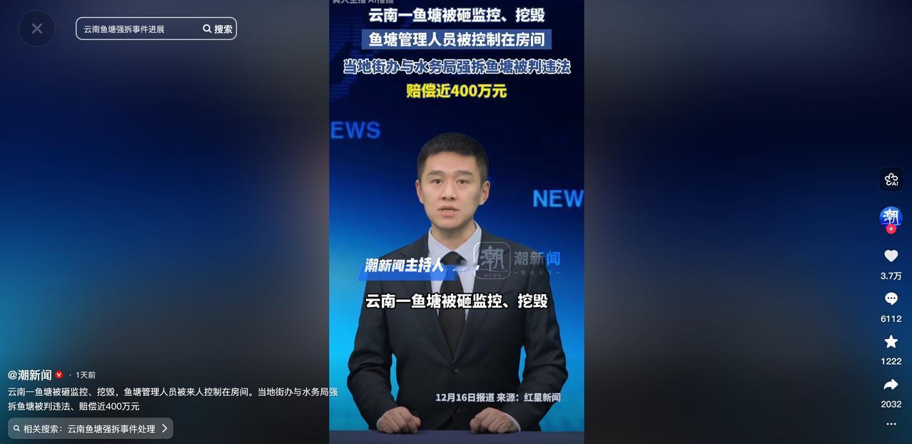 云南曲靖,甘某渔业养殖合作社的鱼塘突然被人挖开,鱼塘里的鱼大量进入河里,剩下的都被渴的干死了,损失超400万。看鱼塘的人说,这群人是晚上9点多钟来的,一来就砸坏了监控,还将他控制住拿走了他的手机。 事发那天晚上 9 点多,他正在鱼塘边的简易房里休息,压根没料到会出事,突然就闯进来一群人,一个个都戴着帽子和口罩,把脸遮得严严实实,根本看不清长相,这群人一来就没按常理出牌,手里拿着长棍,径直就朝着门口的监控摄像头砸了过去,一下就把监控给砸坏了。 还没等敖某反应过来,对方又切断了整个鱼塘区域的监控供电系统,所有的电子眼瞬间都成了摆设,连一点记录都留不下来,紧接着三个壮汉直接闯进了简易房里,不由分说就把敖某控制住,强行收走了他的手机,还把他死死按在床上动弹不得,期间有人冷冷地跟他说 “这事儿跟你没关系”,可这鱼塘是合作社的命根子,怎么可能跟他没关系? 敖某每一次想从床上爬起来看看外面的情况,都会被守在旁边的人狠狠按回去,接下来的几个小时里,他只能躺在黑暗中,听着屋外传来震耳欲聋的挖掘机轰鸣声,那声音一下下撕裂土地,也揪着他的心,他知道合作社的心血正在被一点点毁掉。 直到半夜十二点左右,挖掘机的声音才终于停了下来,有人在外面拍了些照片,然后这群遮着脸的人就跟来时一样,迅速消失在了夜色里,敖某好不容易挣脱控制,冲出房门一看,眼前的景象让他瞬间傻了眼,心里凉透了。 五个精心打理的鱼塘,被挖掘机豁开了好几个大口子,尤其是其中三个,缺口大得吓人,原本满满当当的池水早就流得一干二净,塘底的淤泥都露了出来,大量的鱼顺着水流冲进了旁边的河道,成了无主之物,再也找不回来了,而那些没来得及逃走的鱼,只能在干涸的淤泥里剧烈挣扎,最后因为缺水缺氧,一条条活活干死,场面惨不忍睹。 其实这事儿也不是凭空发生的,早在 2023 年 6 月,沾益区的水务部门就给合作社发了整改通知,说鱼塘所在的地方是南盘江的护堤地,按照规定不能挖鱼塘,属于违规建筑要求他们整改,可甘某当初开挖鱼塘的时候,是拿着社区和街道办盖章的审批手续才动的工,前后投了不少钱,怎么突然就违规了? 接到整改通知的时候,正是七八月的酷暑天,合作社养的鱼苗原本计划运往重庆,可这么高的温度,长途运输的话,鱼苗的存活率极低,强行转移简直就是把钱往火坑里扔。 为了保住这些 “活资产”,7 月 27 号的时候,合作社特意给有关部门递了延期申请,希望能宽限两个月,等秋凉了再把鱼苗安全运走,然后再整改,可这份合情合理的申请交上去之后,就石沉大海了,别说同意连个拒绝的书面解释都没有。 谁也没想到等来的不是答复,而是这么一场 “半夜突袭”,后来大家才知道,这群人是街道办和水务部门的工作人员,可就算鱼塘真的违规,也不能用这种方式执法啊?砸监控、断电源、控制守塘人、没收手机,这哪儿像是行政执法简直就跟土匪一样。 按照法律规定,就算是合法的强拆,也得出示执法证件、通知当事人到场、说明理由才行,可那天晚上,这些程序全都没有,只有遮着脸的人、粗暴的控制和轰鸣的挖掘机,最后法院一审判决,认定涉事的街道办和水务部门行为违法,得连带赔偿合作社 392 万多,街道办还得单独赔偿 3 万多。 可这事儿还没完,涉事的两个单位不服判决,已经提起了上诉,甘某的合作社虽然赢了一审,但那些干死在泥地里的鱼,还有这 400 多万的损失,想要真正讨回公道,还得等二审的结果。 好好的养殖生意,就因为这么一场野蛮的 “执法”,落得个血本无归的下场,换谁也接受不了,这事儿也给大家提了个醒,就算是执法,也得讲规矩、守法律,不能凭着权力就肆意妄为,不然最终还是得为自己的行为买单。