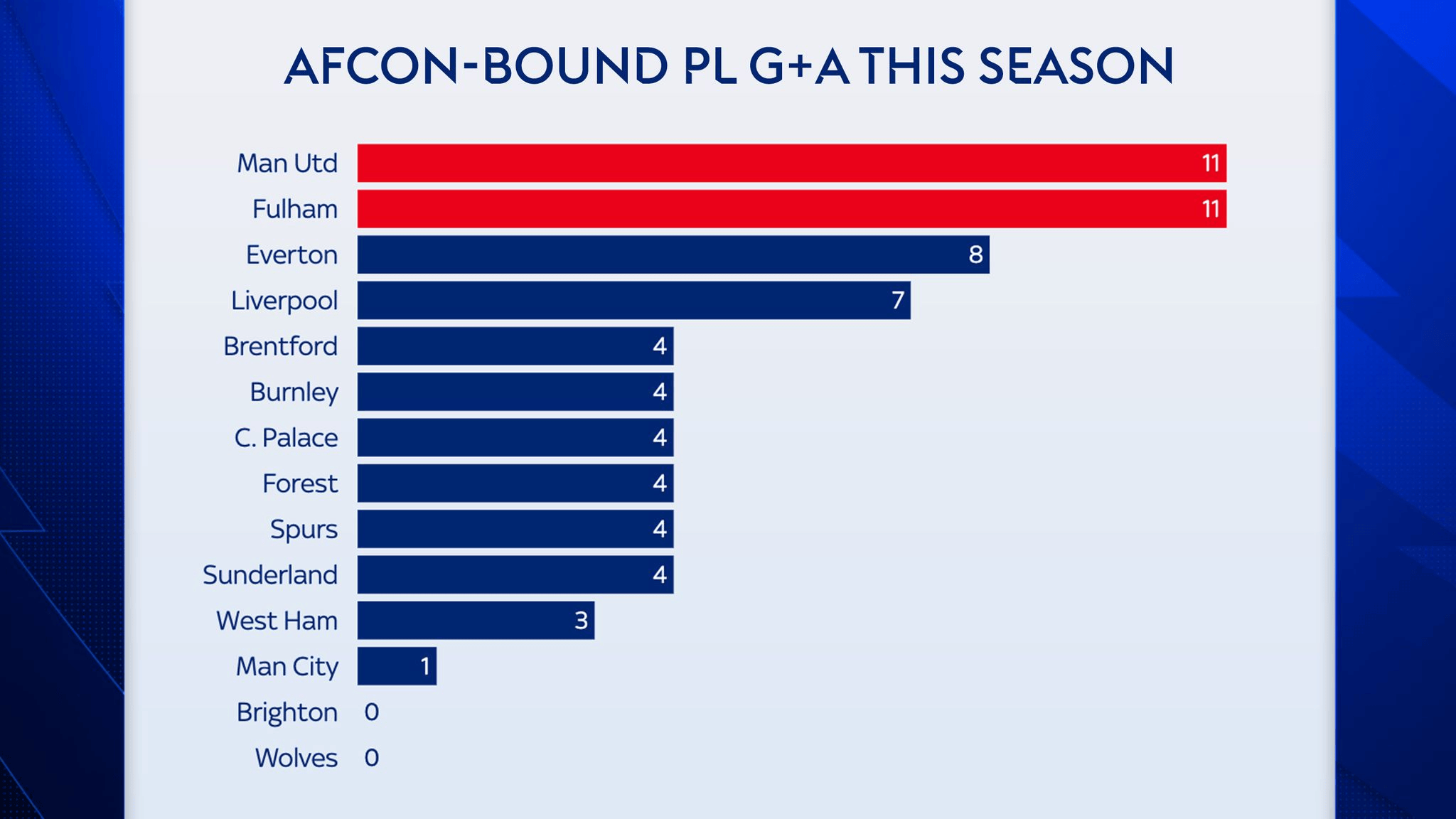 据统计,共有32名英超球员参加本届非洲杯,来自14支参赛国家队。那么,哪些英超球队受到的影响最大?天空体育数据专栏《BetweentheLines》针对英超20支球队受此赛事影响的程度进行了深度分析