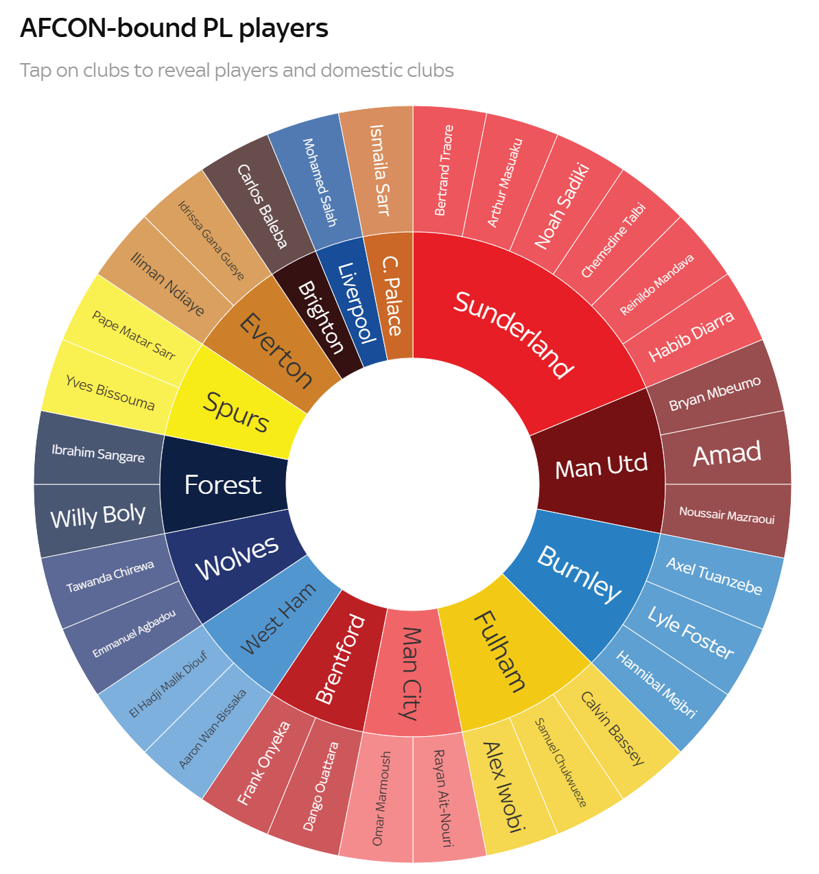 虎扑12月18日讯2025年非洲杯将于本周末在摩洛哥正式打响,英超多名非洲国脚已在本周前往国家队报到。本次赛事的决赛时间为1月18日,这意味着部分球员可能缺席俱乐部比赛超过一个月。
