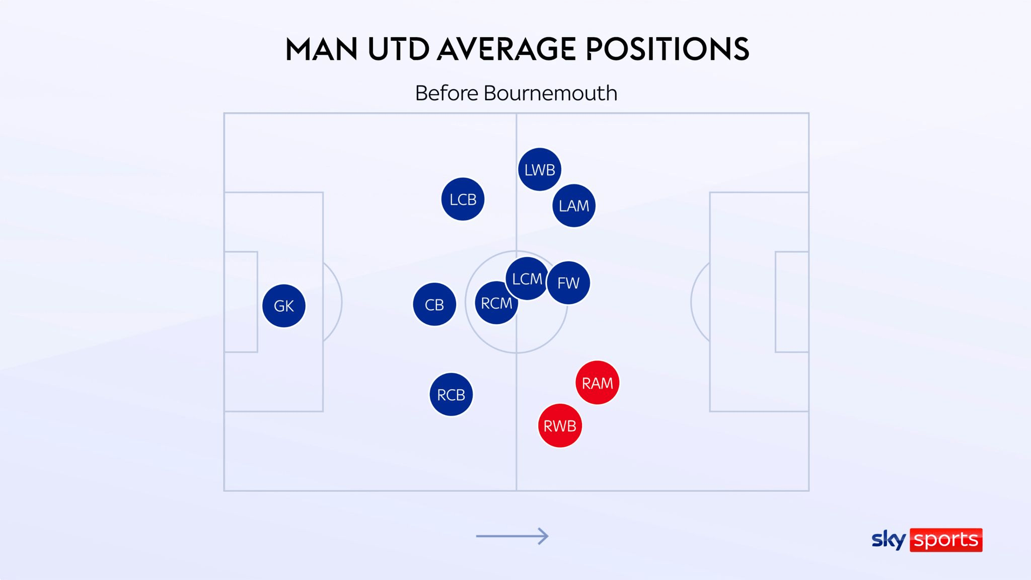 曼联主帅阿莫林在上轮英超对阵伯恩茅斯的比赛中,罕见地将阵型从惯用的3-4-2-1改为四后卫体系。