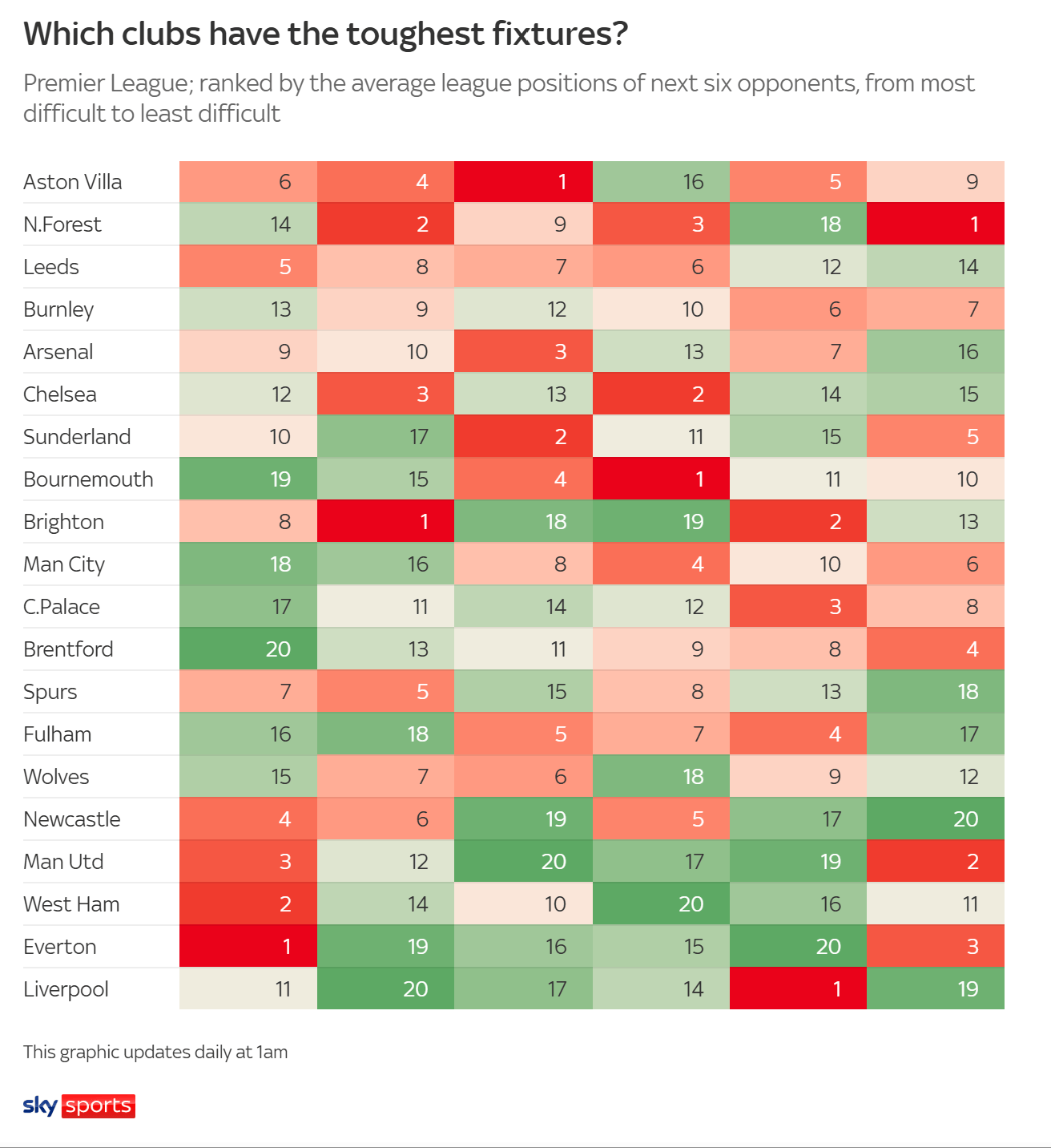 在非洲杯期间赛程难度方面,未损失球员的阿斯顿维拉赛程最艰难;而仅缺少萨拉赫的利物浦,赛程相对最为轻松。