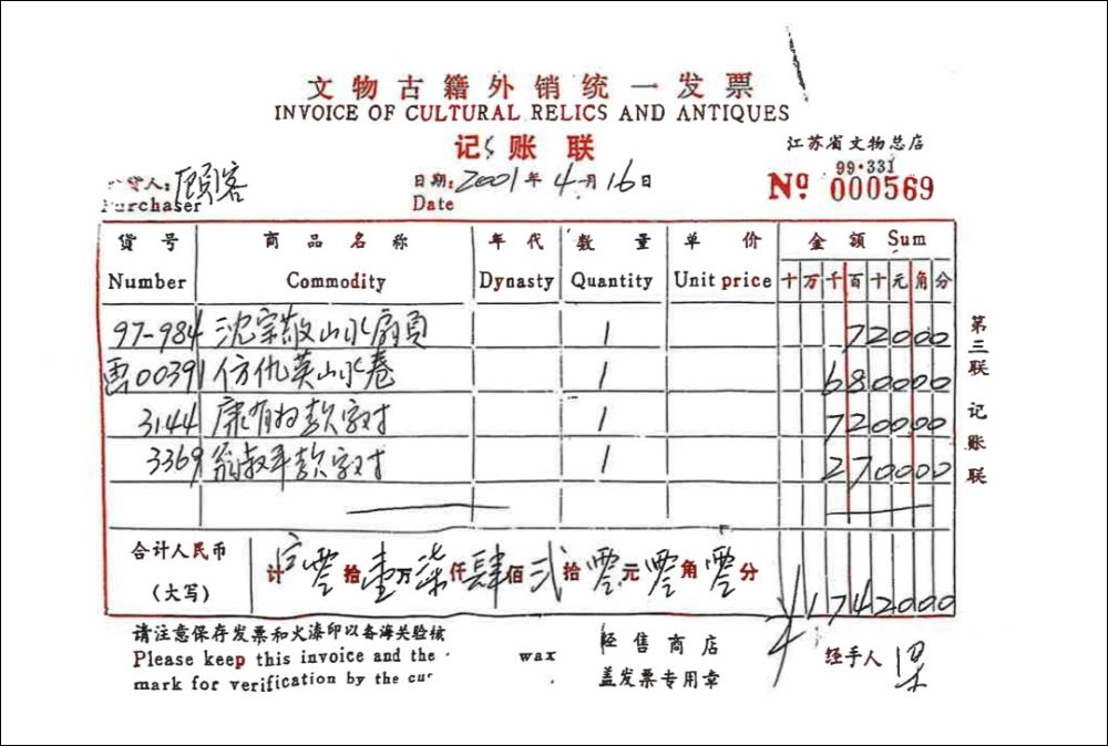 原江苏省文物总店销售发票显示,《仿仇英山水卷》于2001年4月16日被“顾客”以6800元价格购买。(受访者供图)